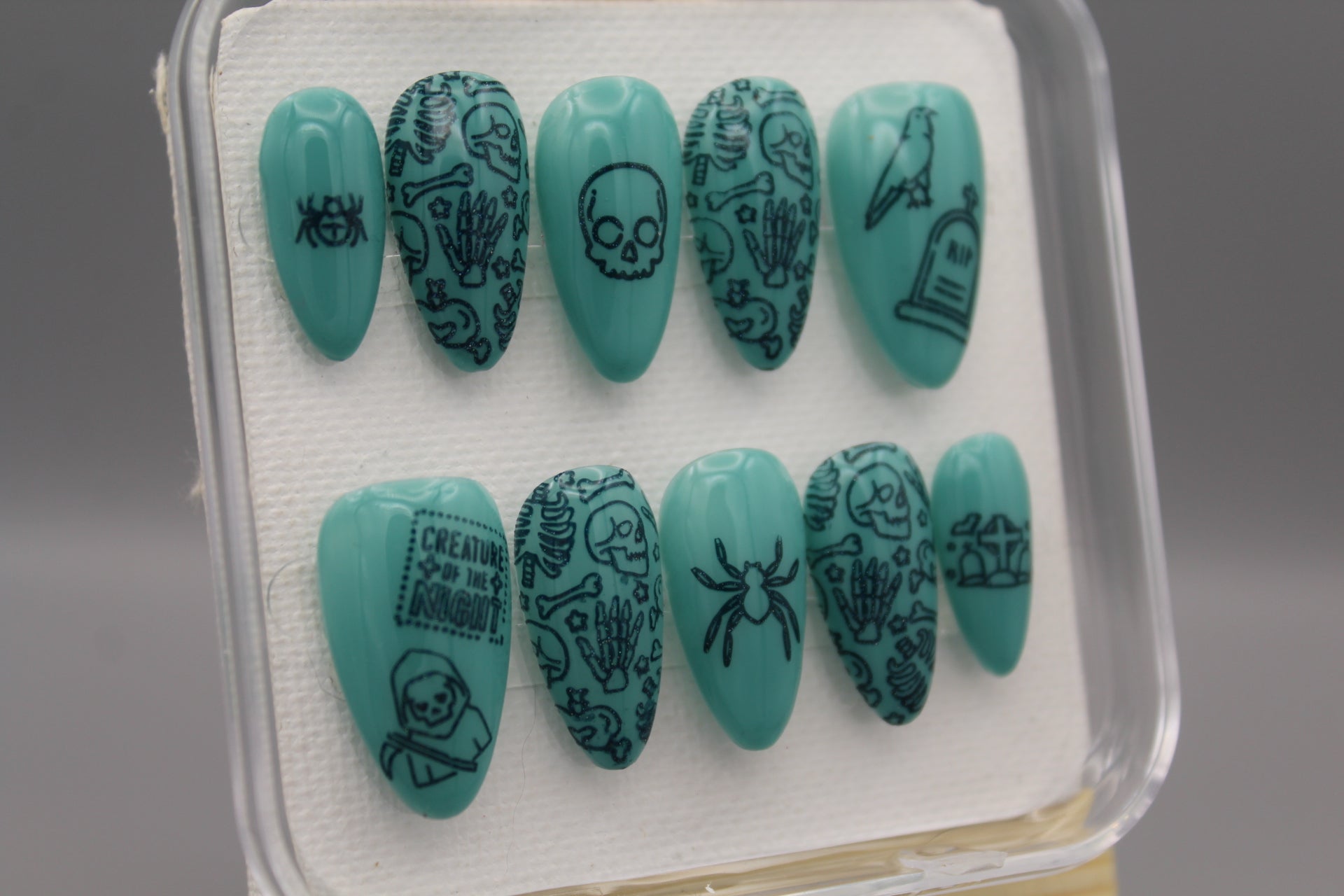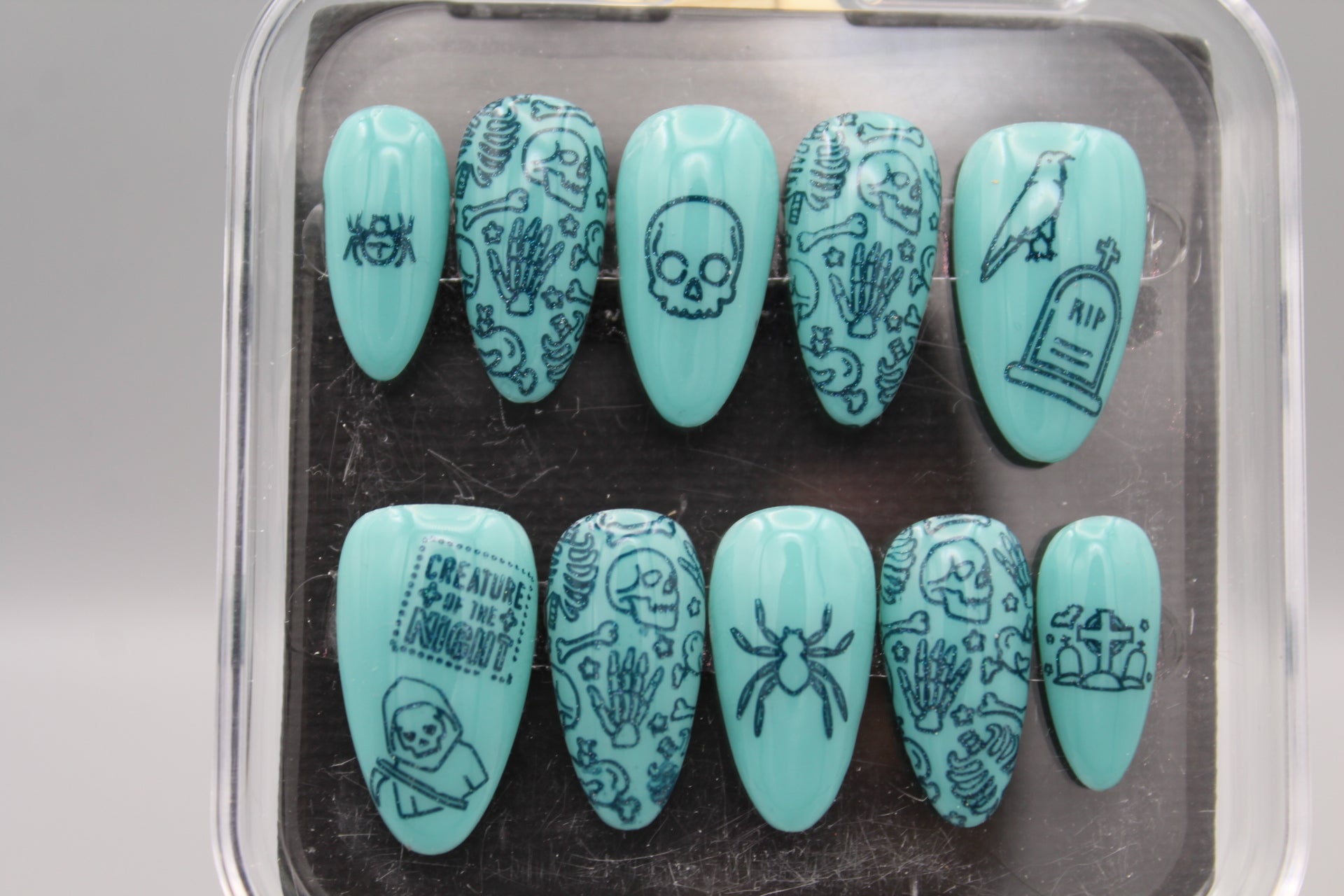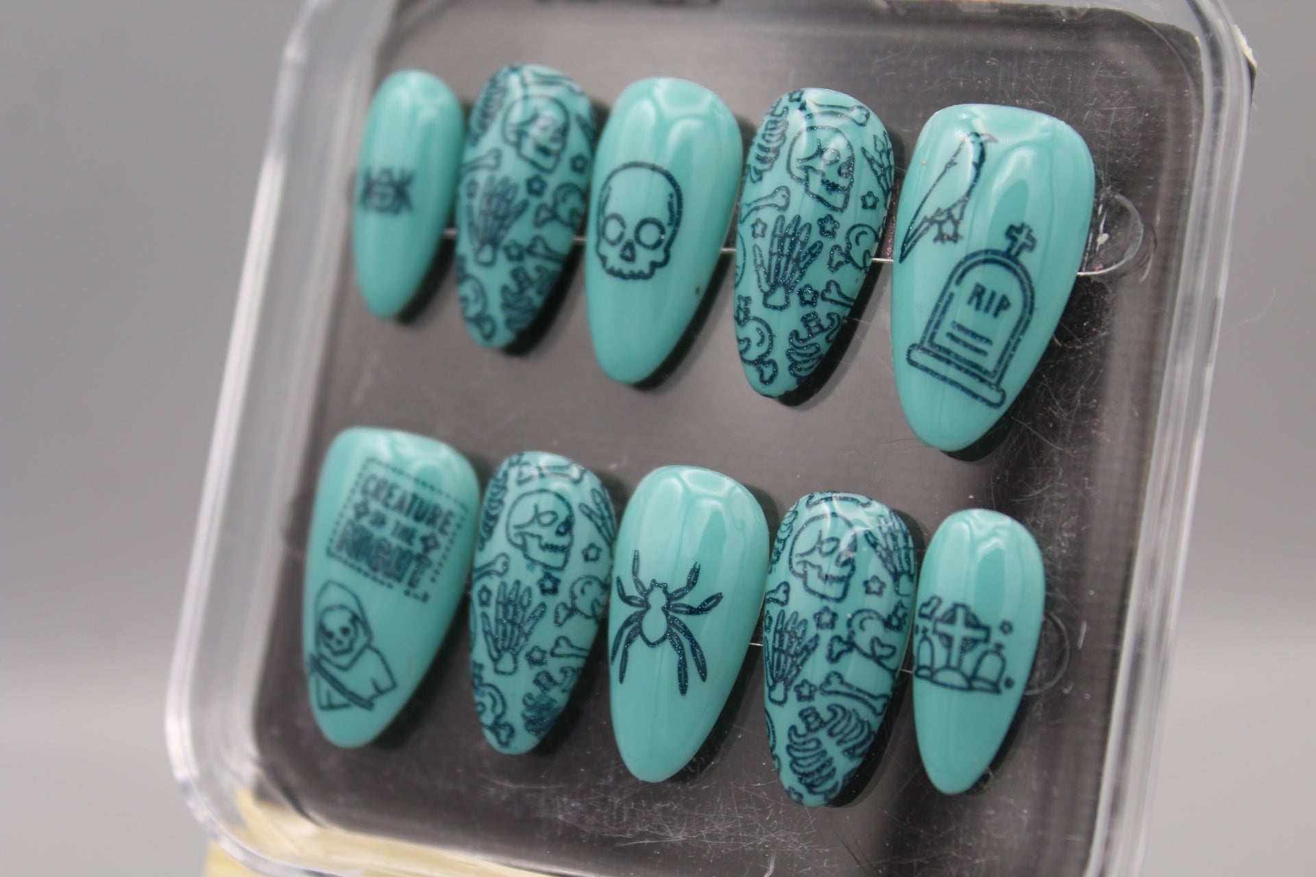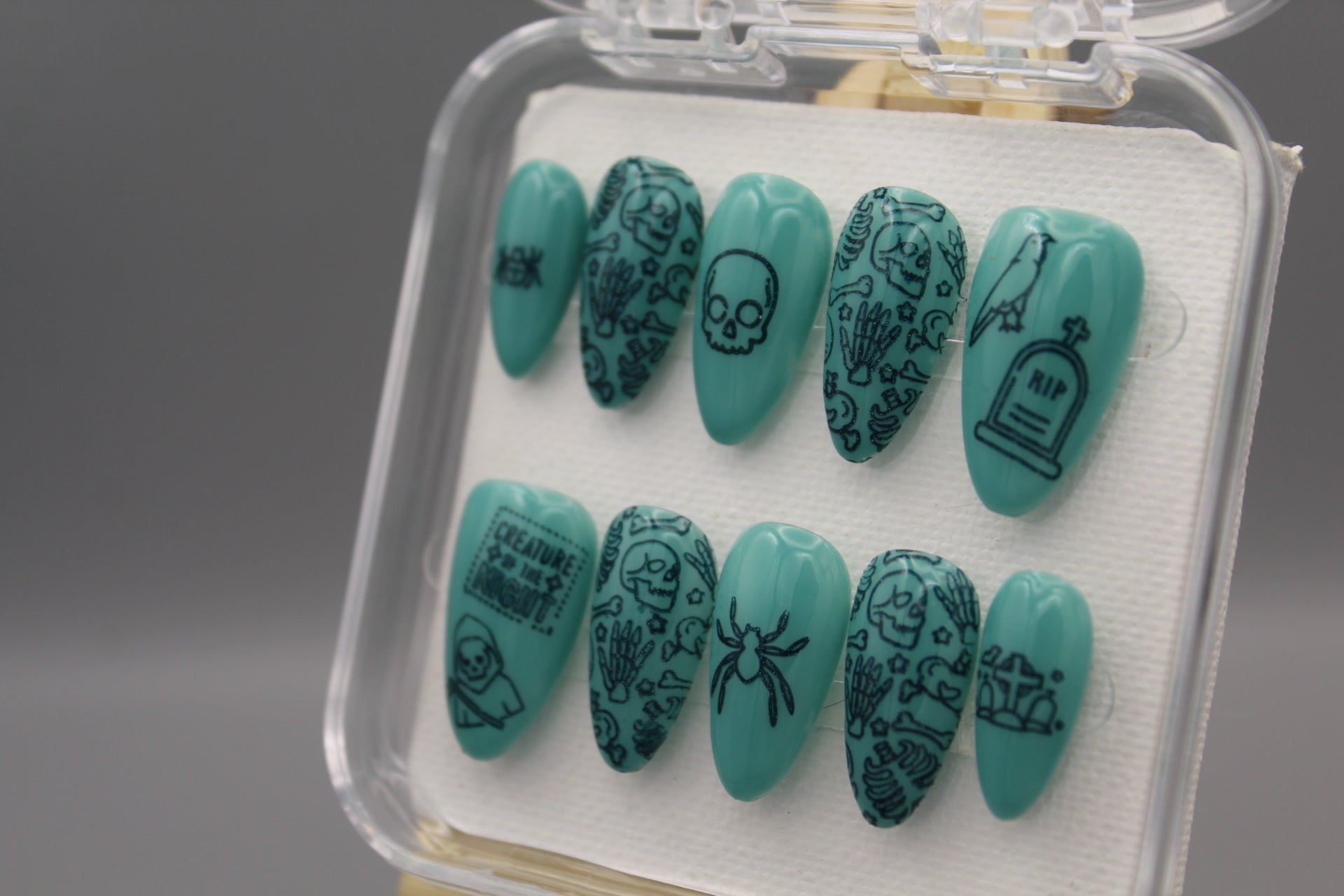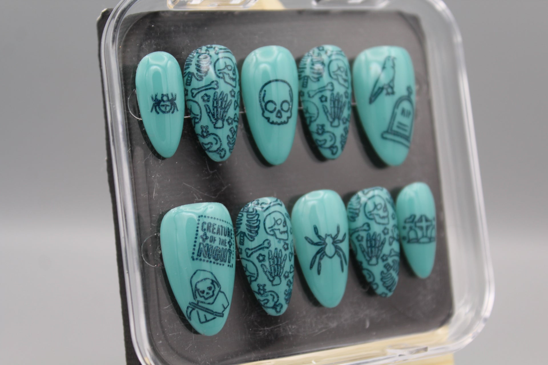 Get into the spooky spirit with the "Wicked Creatures" Halloween nail set! Featuring a gorgeous teal background with glittery turquoise designs, these nails bring a creepy yet fun vibe to your look. Perfect for adding a wicked touch to your Halloween style while keeping things playful and eye-catching.