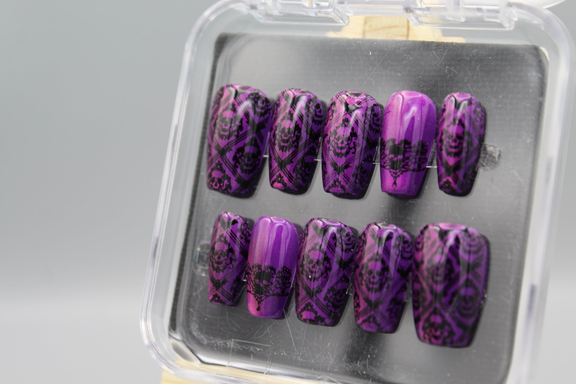 Elevate your nail game with Gothic Lace Purple, a sophisticated nail set that blends gothic edge with classy charm. Featuring a deep purple magnetic shimmer, these nails catch the light with a mysterious allure perfect for any occasion. Add a touch of dark elegance and playful sophistication to your look with this stunning set.