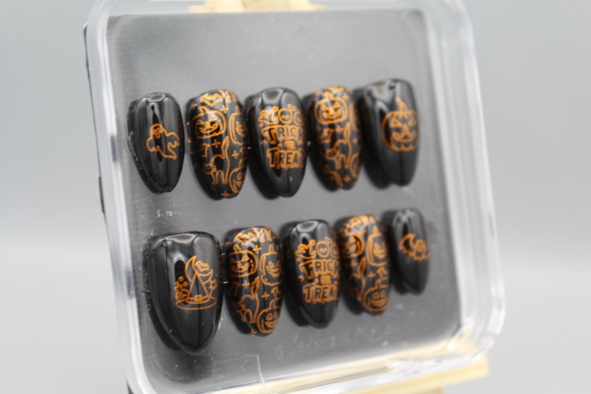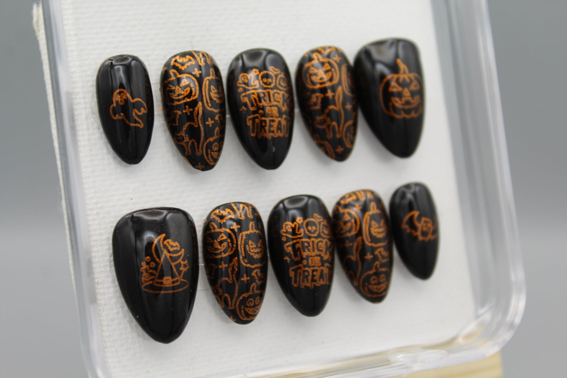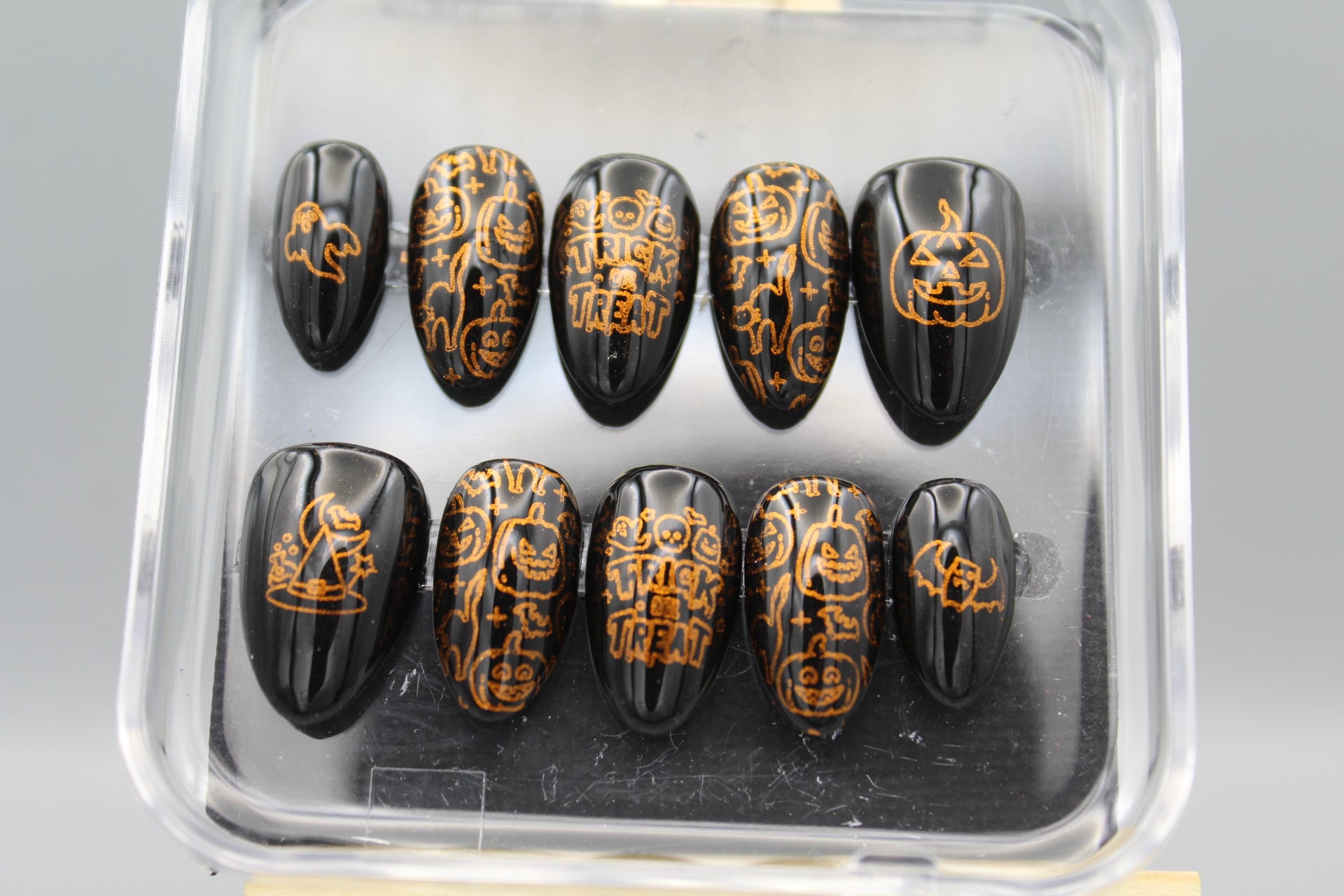 Get ready for Halloween with the "Trick or Treat!" nail set! Featuring classic black nails adorned with metallic orange Halloween designs, this set brings festive charm to your fingertips. Perfect for adding a playful and spooky touch to your look this season.