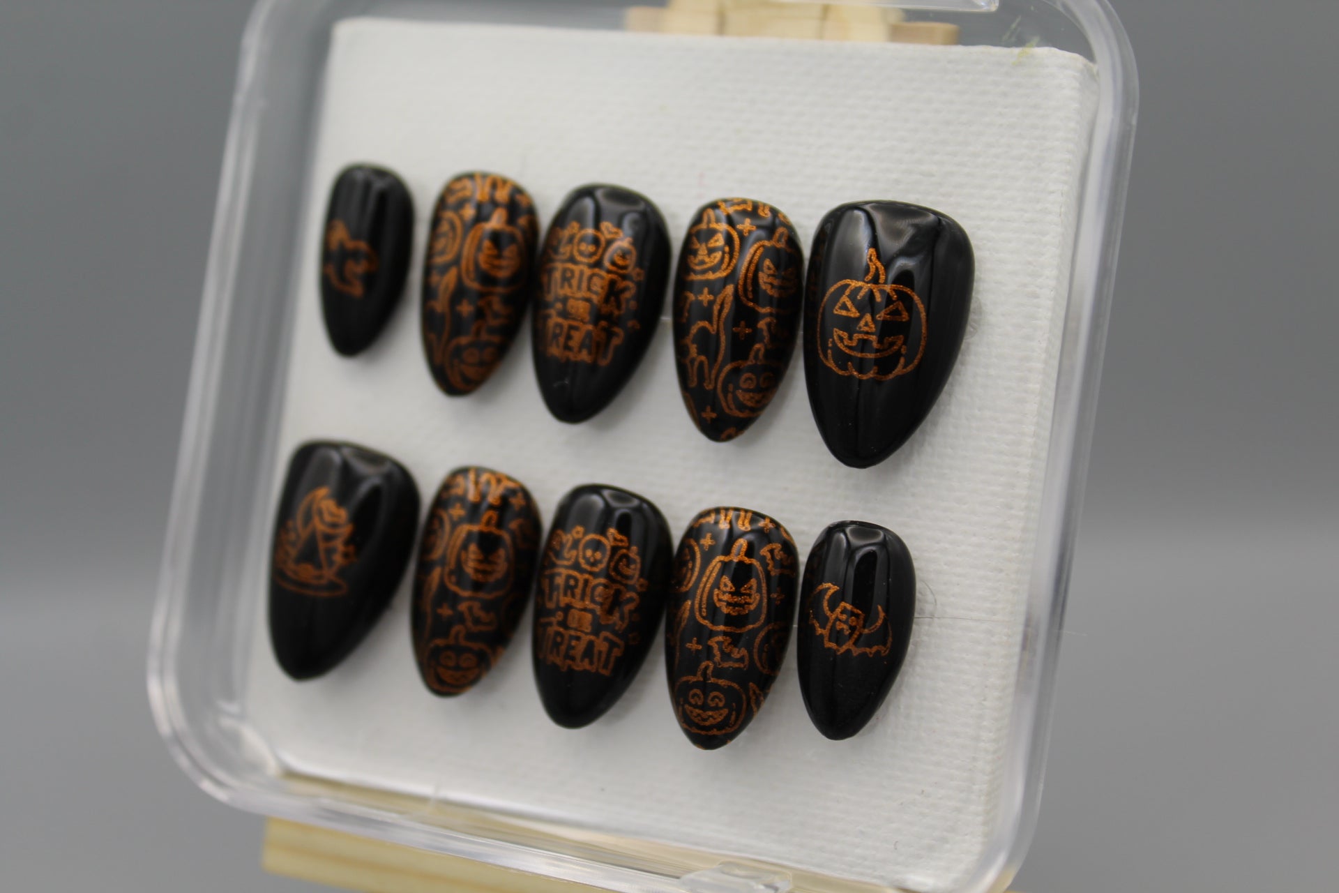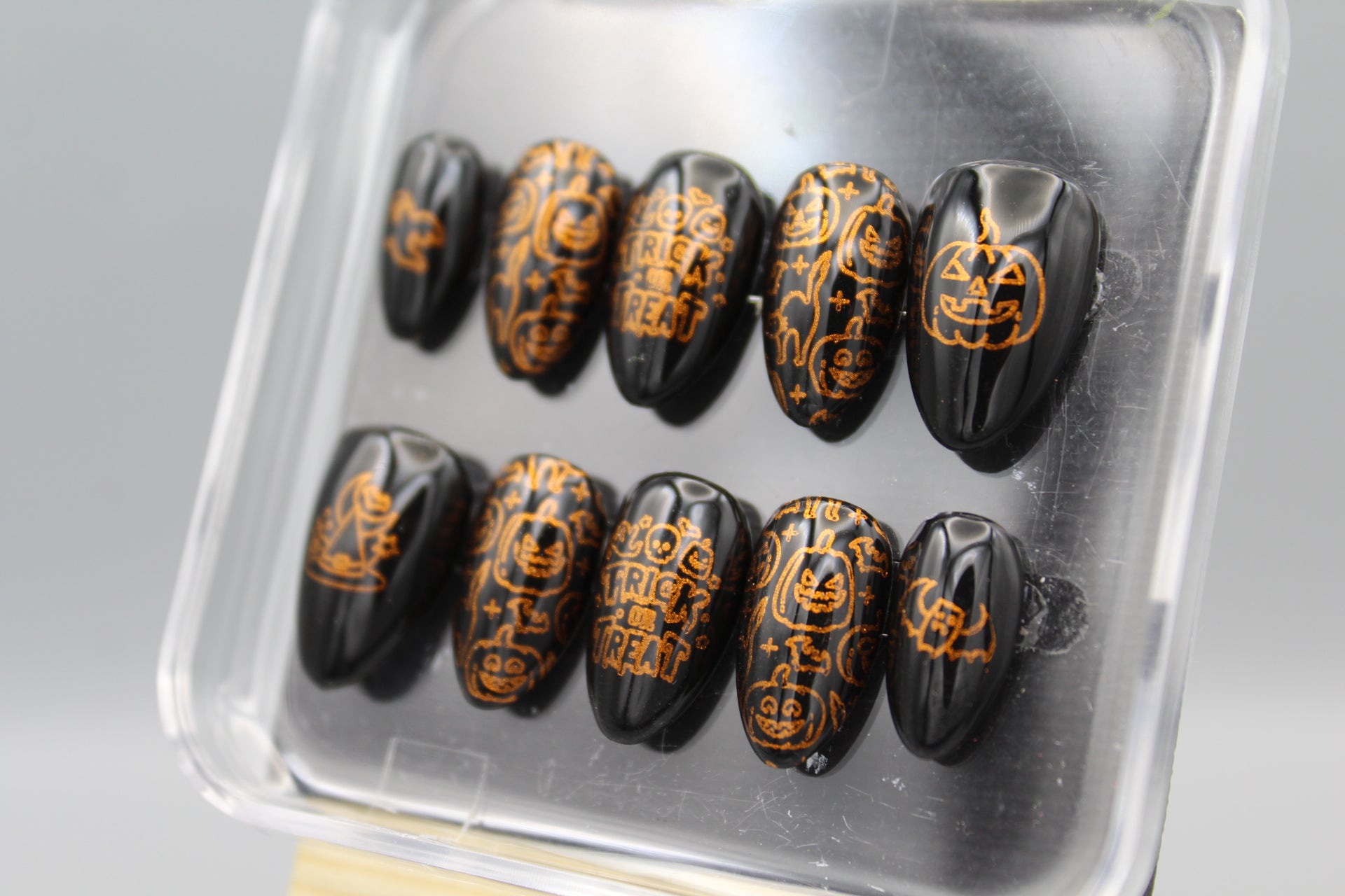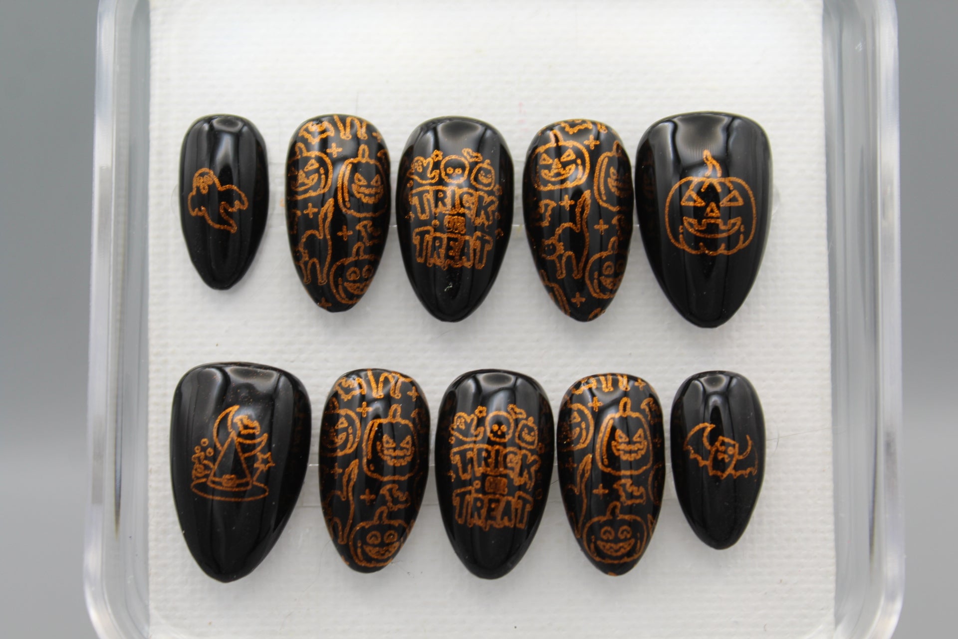 Get ready for Halloween with the "Trick or Treat!" nail set! Featuring classic black nails adorned with metallic orange Halloween designs, this set brings festive charm to your fingertips. Perfect for adding a playful and spooky touch to your look this season.