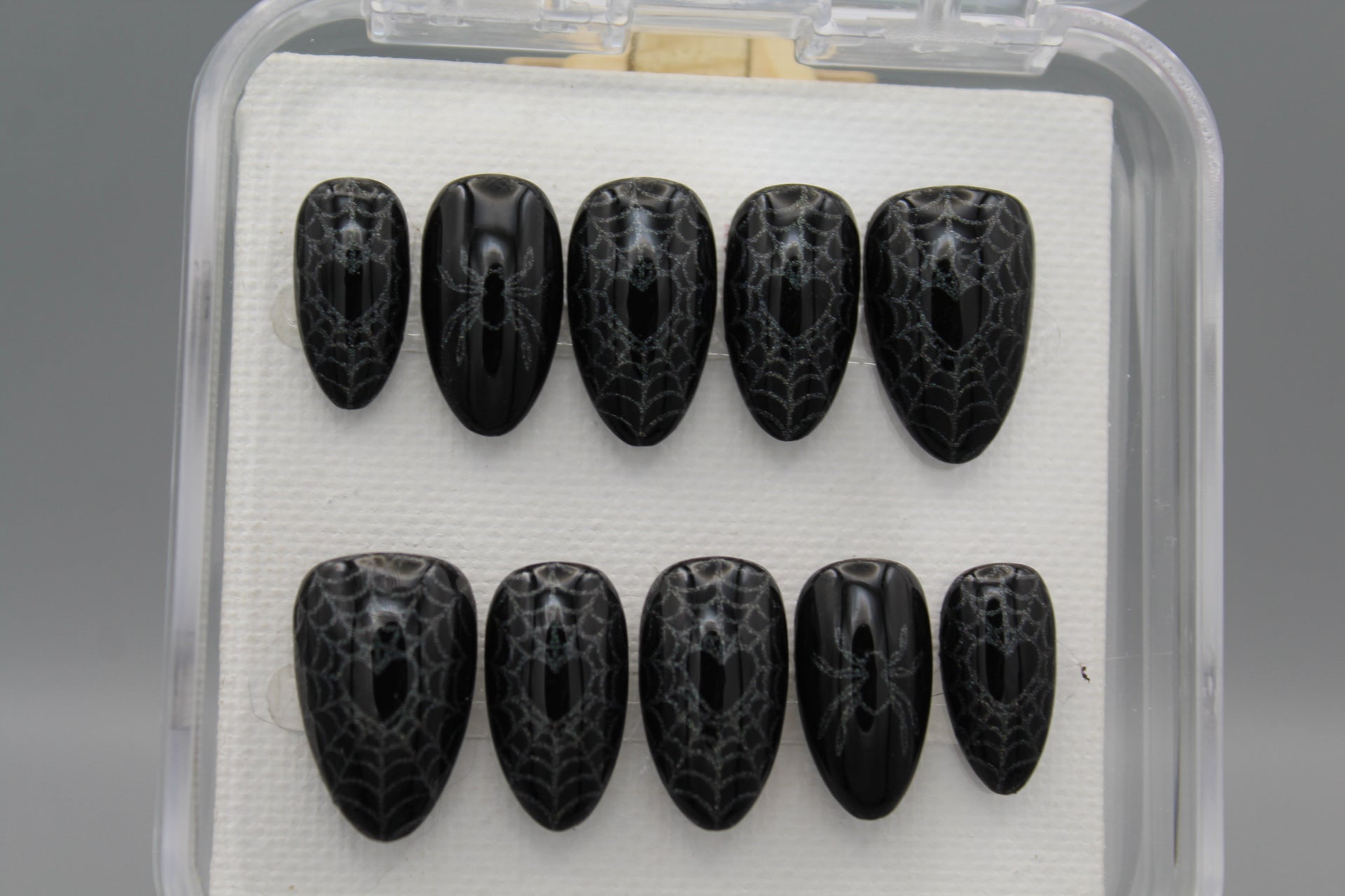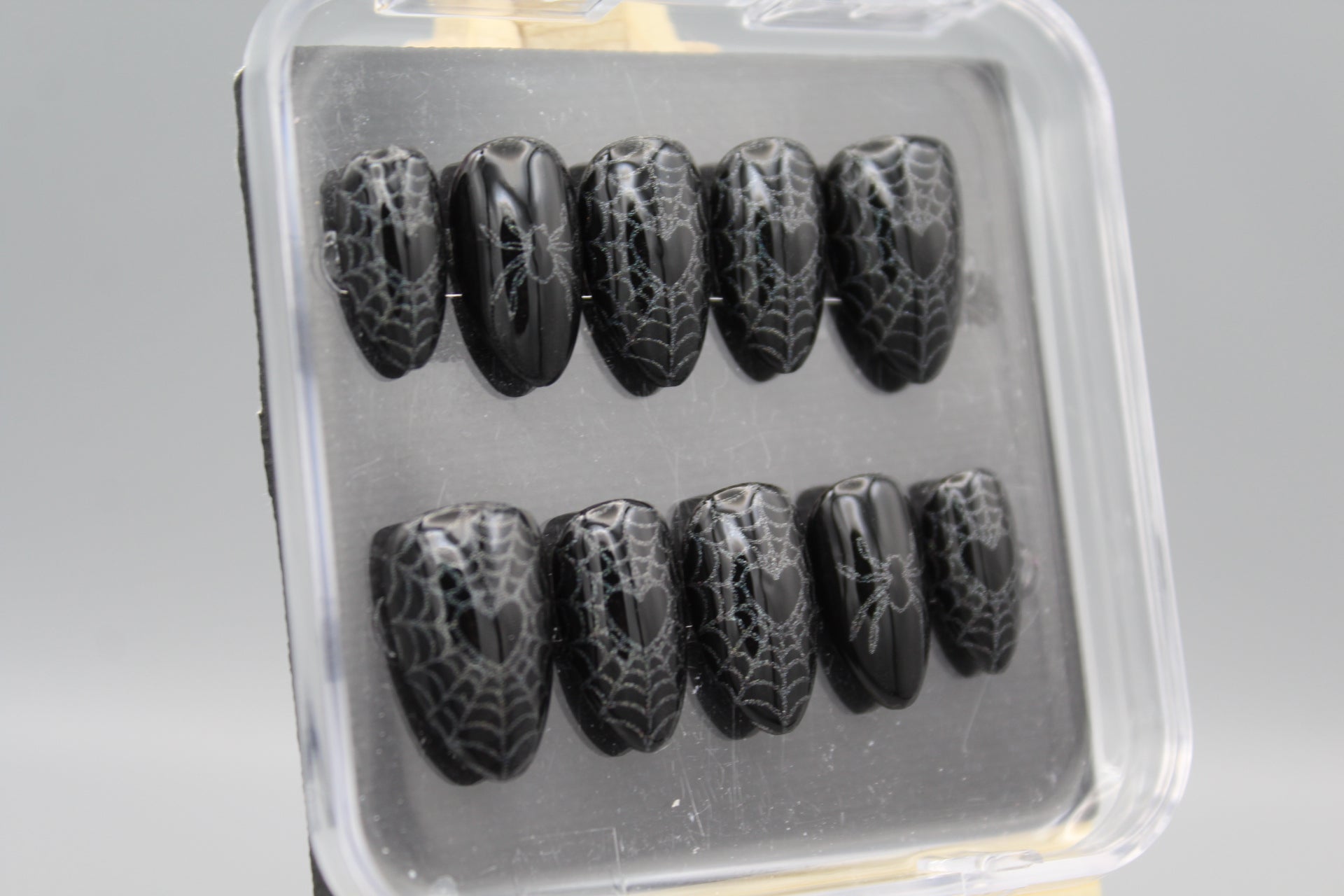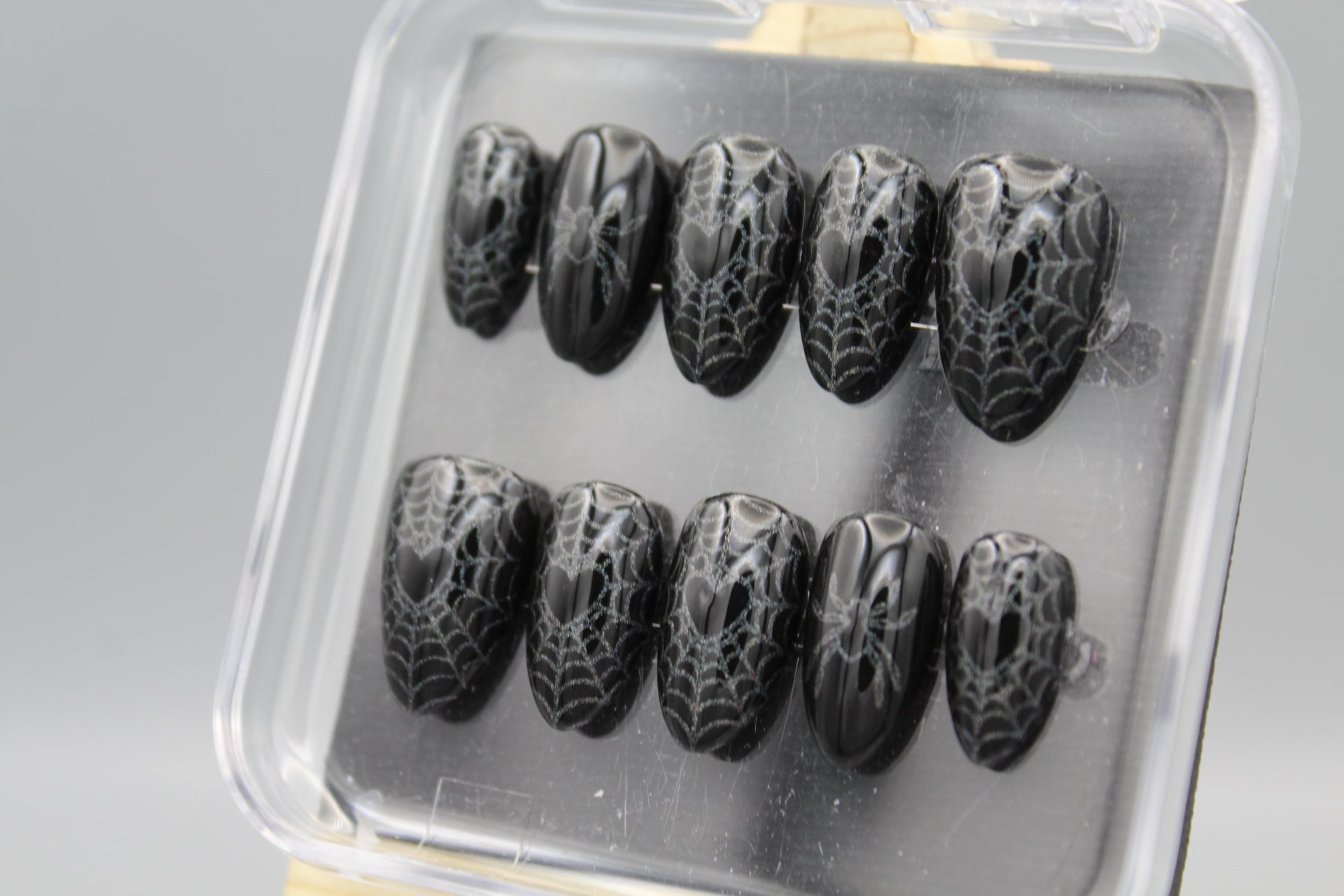 Celebrate Halloween in style with the "Web Design" nail set. Featuring holographic silver spider patterns on a sleek black background, these nails add a spooky yet glittery twist to your look. Perfect for showing off your playful side while embracing the season’s eerie vibes. Easy to apply and sure to catch compliments wherever you go!