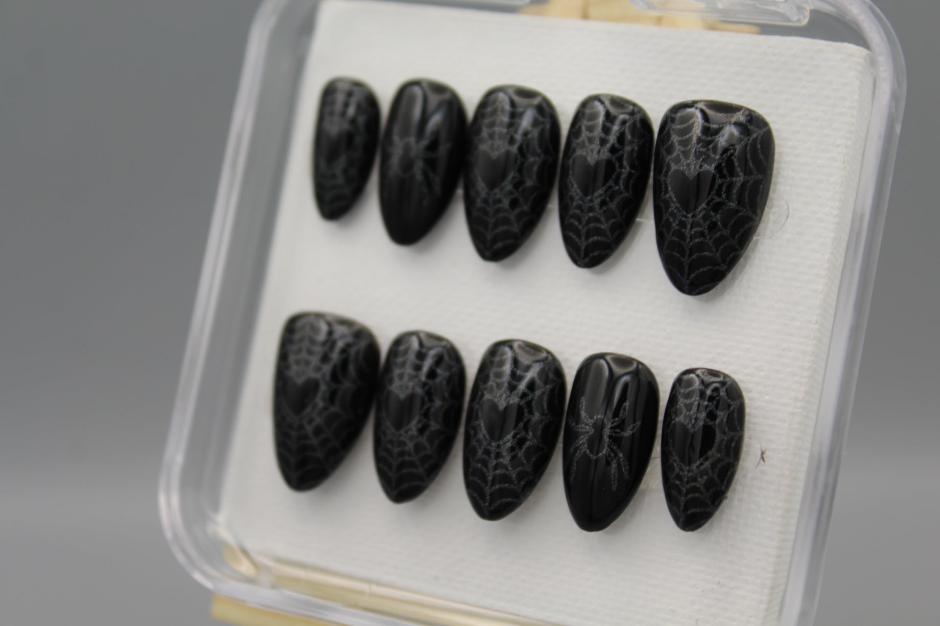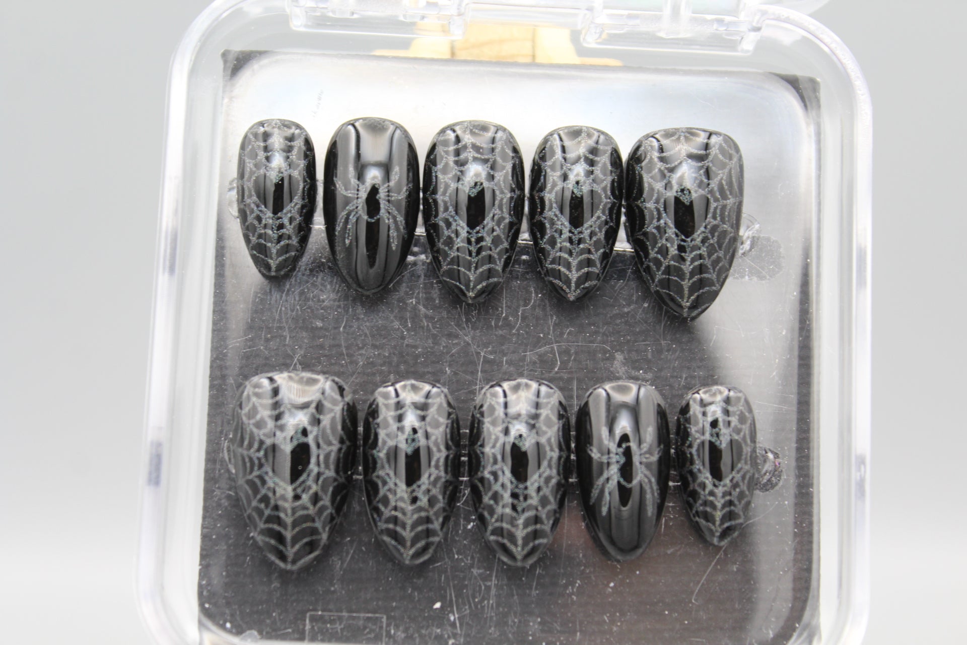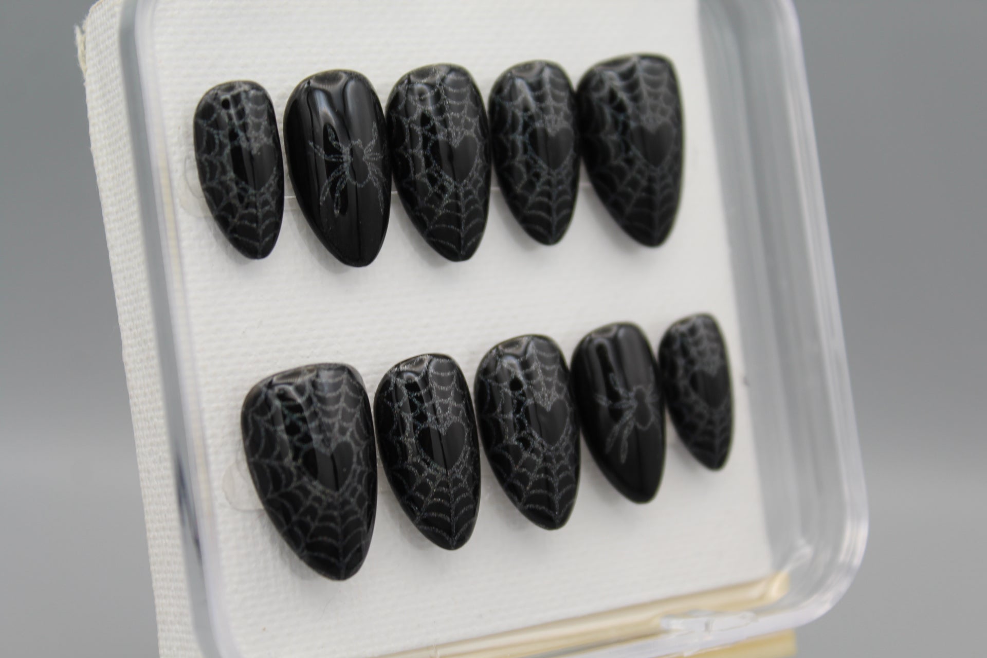 Celebrate Halloween in style with the "Web Design" nail set. Featuring holographic silver spider patterns on a sleek black background, these nails add a spooky yet glittery twist to your look. Perfect for showing off your playful side while embracing the season’s eerie vibes. Easy to apply and sure to catch compliments wherever you go!