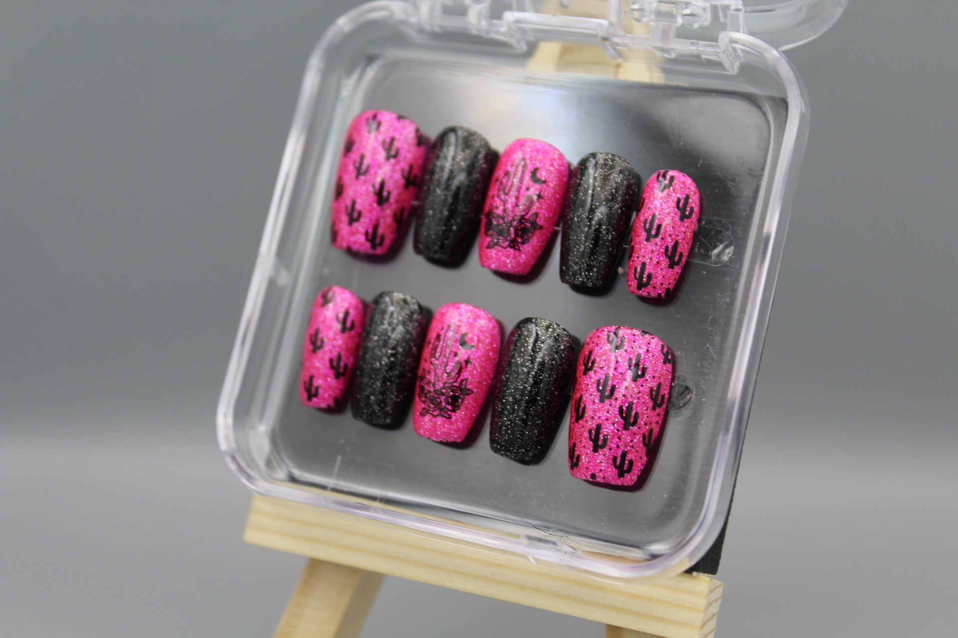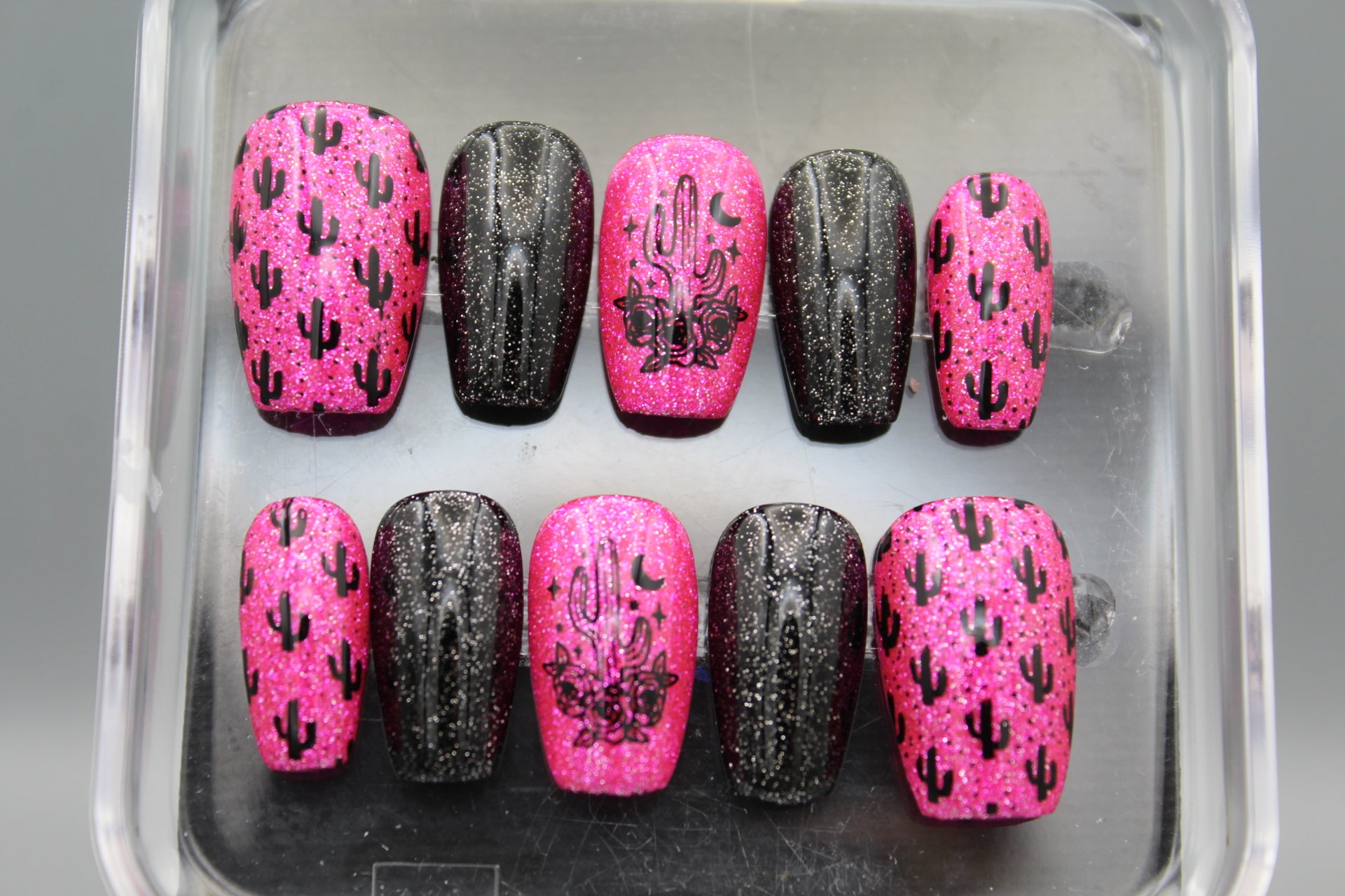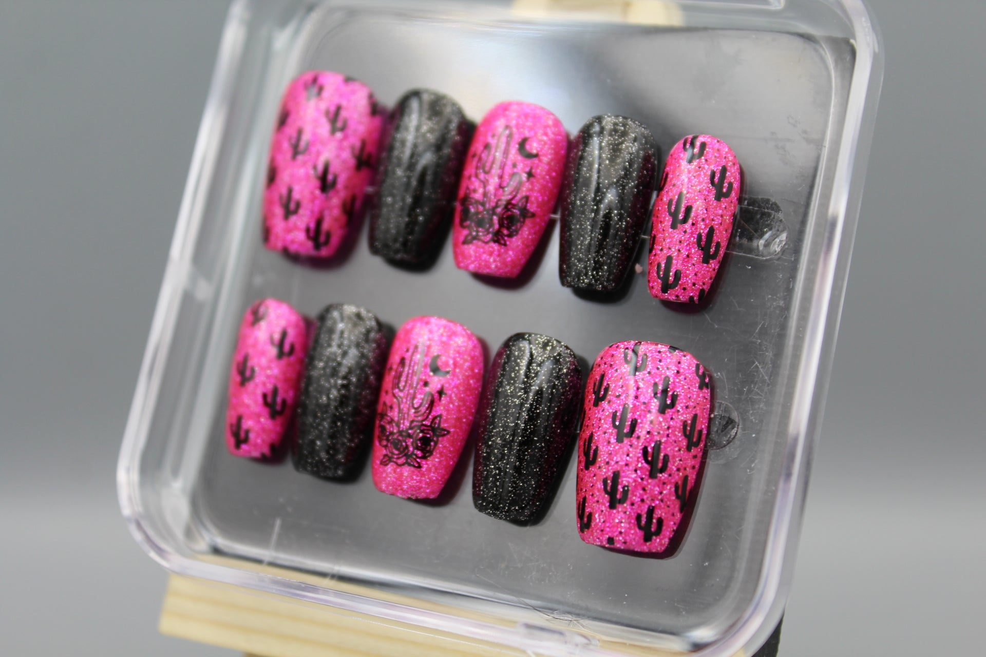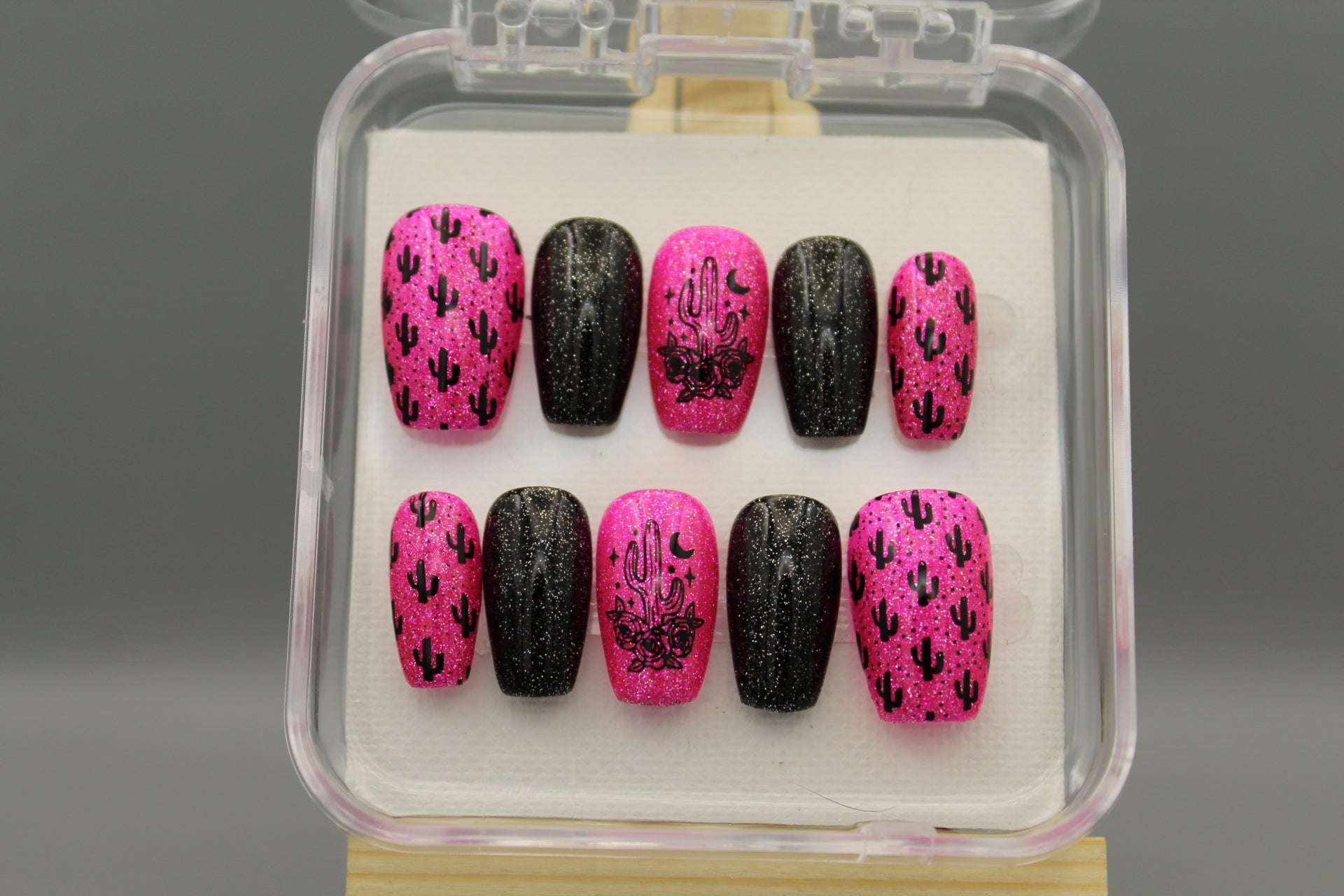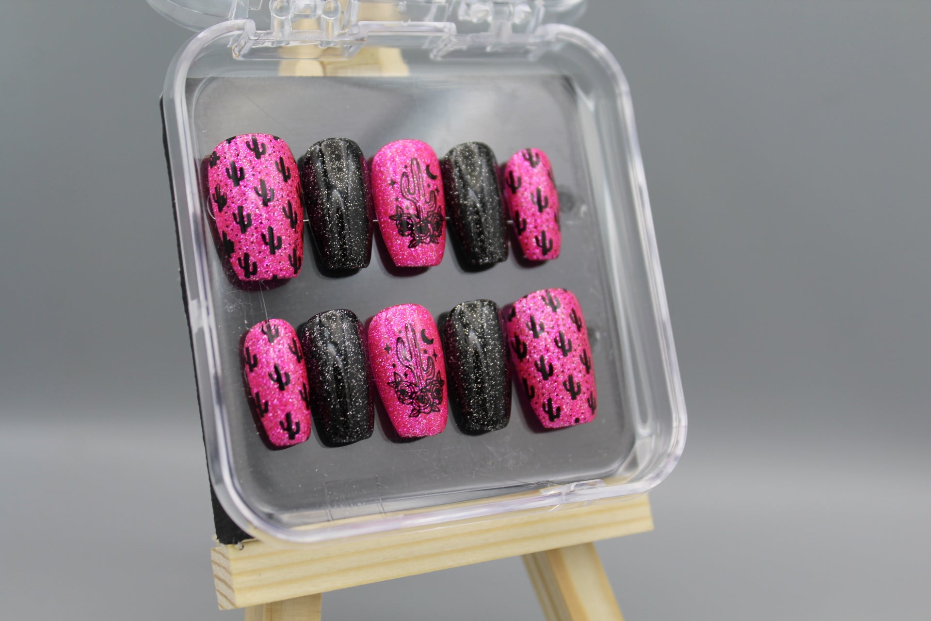 Make a bold statement with the Desert Diva nail set, featuring dazzling hot pink and black glitter accented by playful cactus designs. This vibrant set adds a fun, eye-catching touch to your look, perfect for showing off your wild side with a sparkling desert vibe.