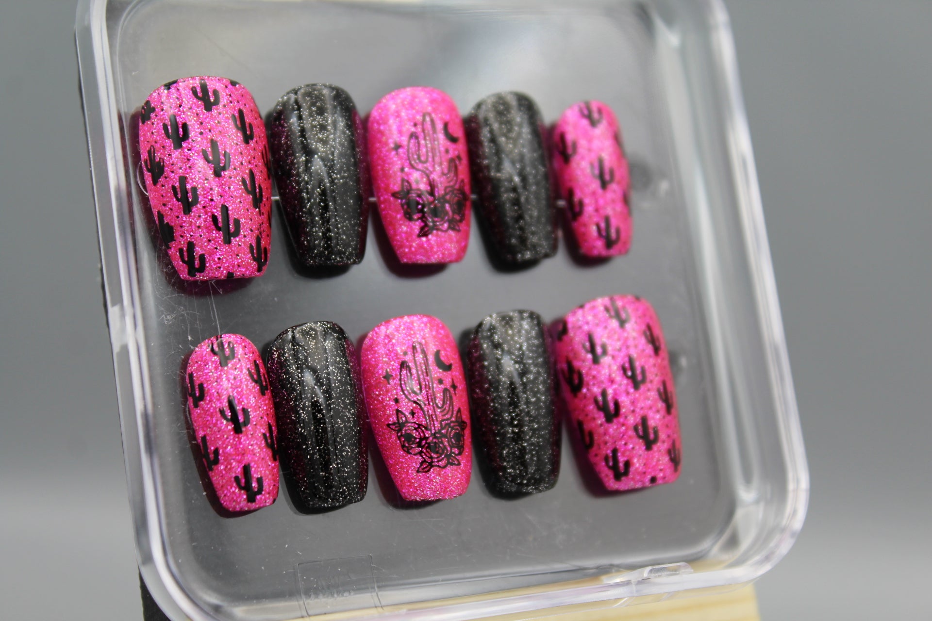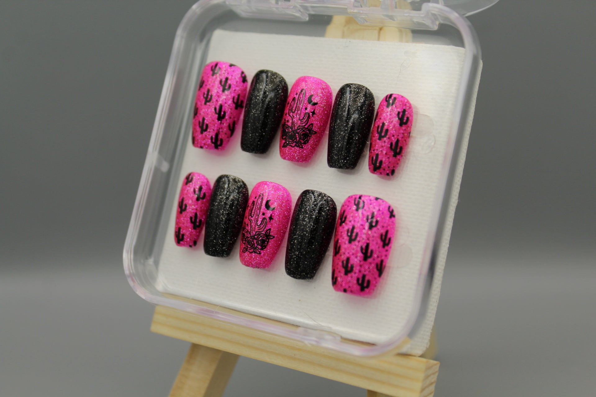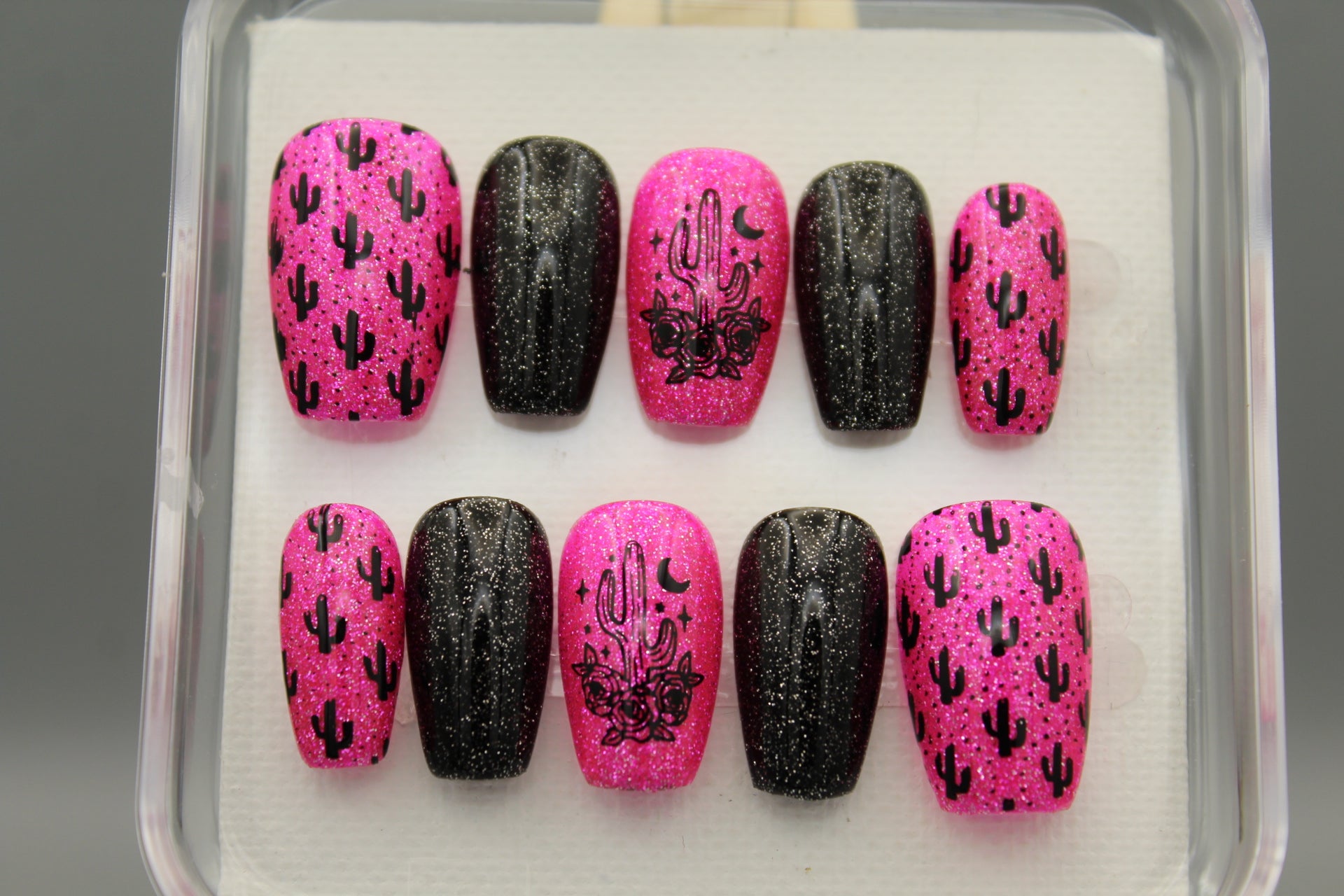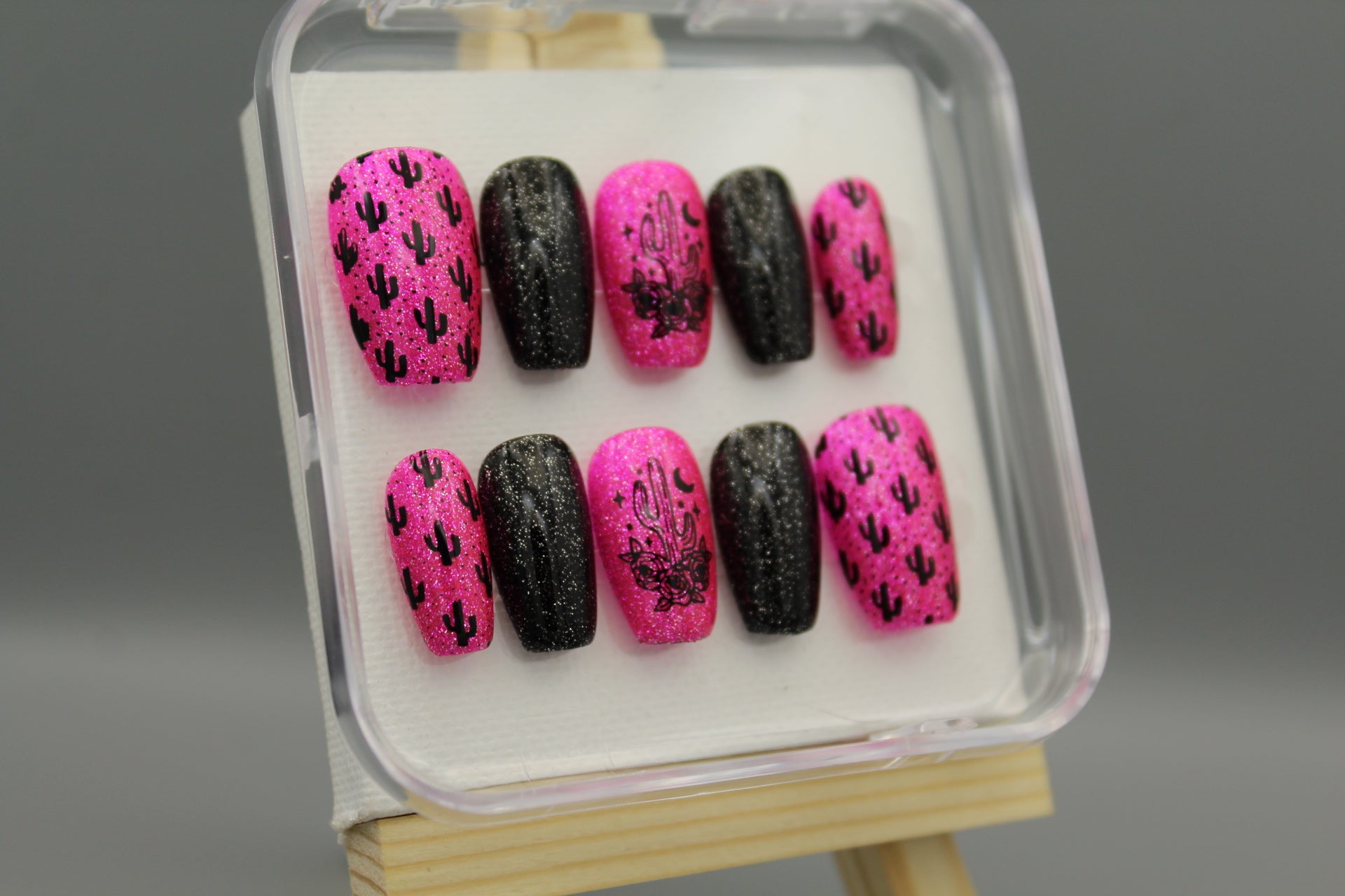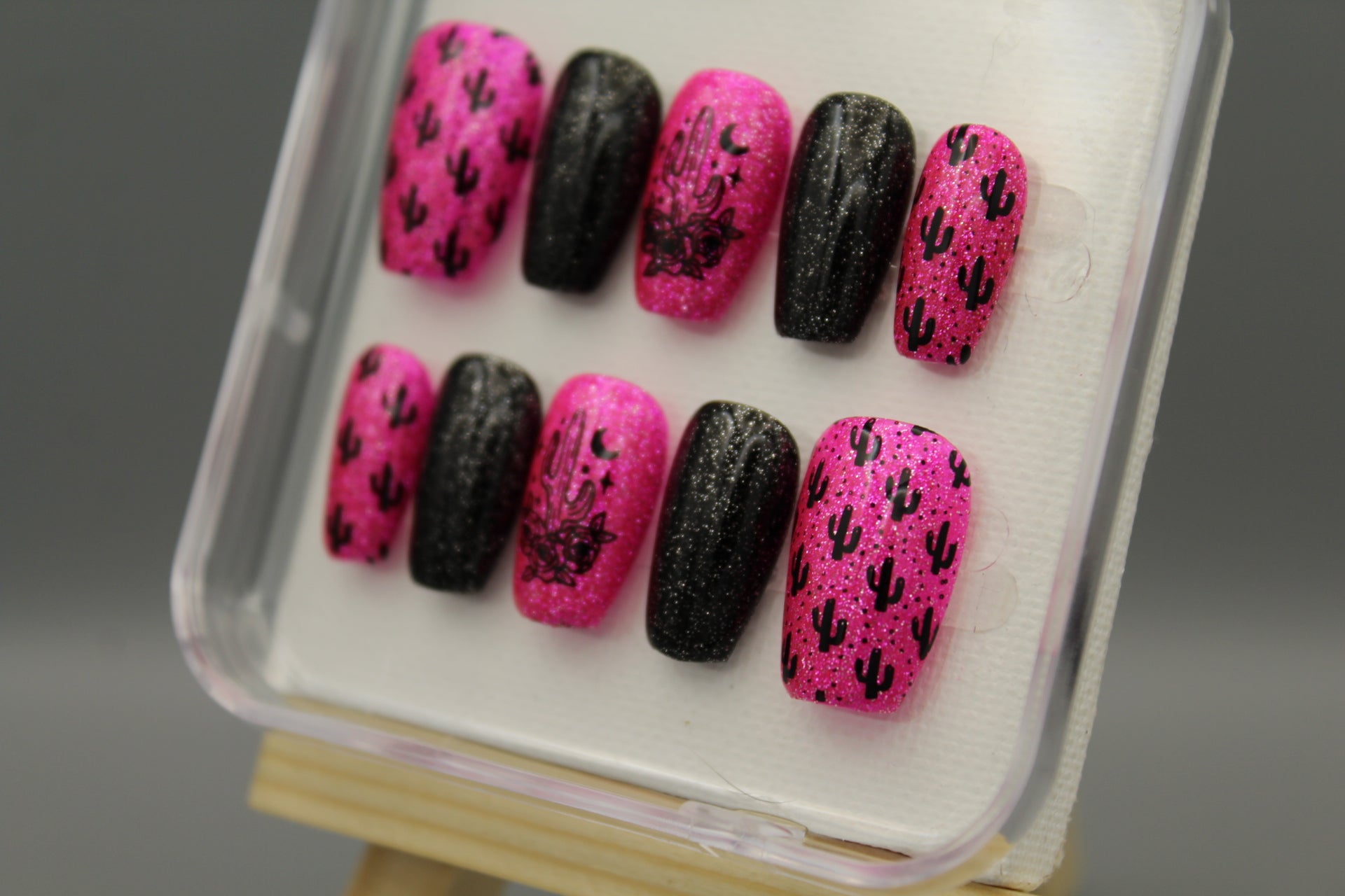 Make a bold statement with the Desert Diva nail set, featuring dazzling hot pink and black glitter accented by playful cactus designs. This vibrant set adds a fun, eye-catching touch to your look, perfect for showing off your wild side with a sparkling desert vibe.