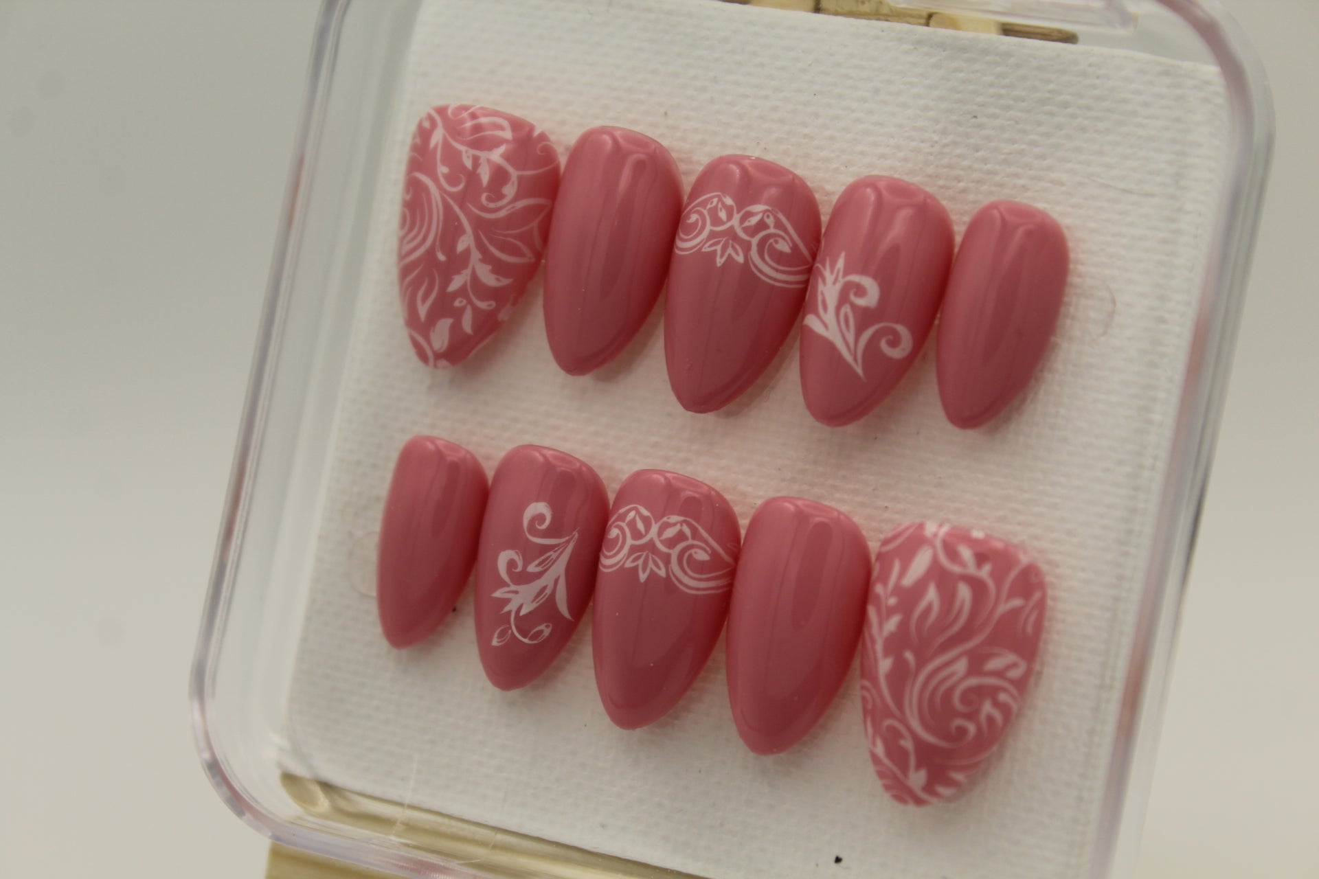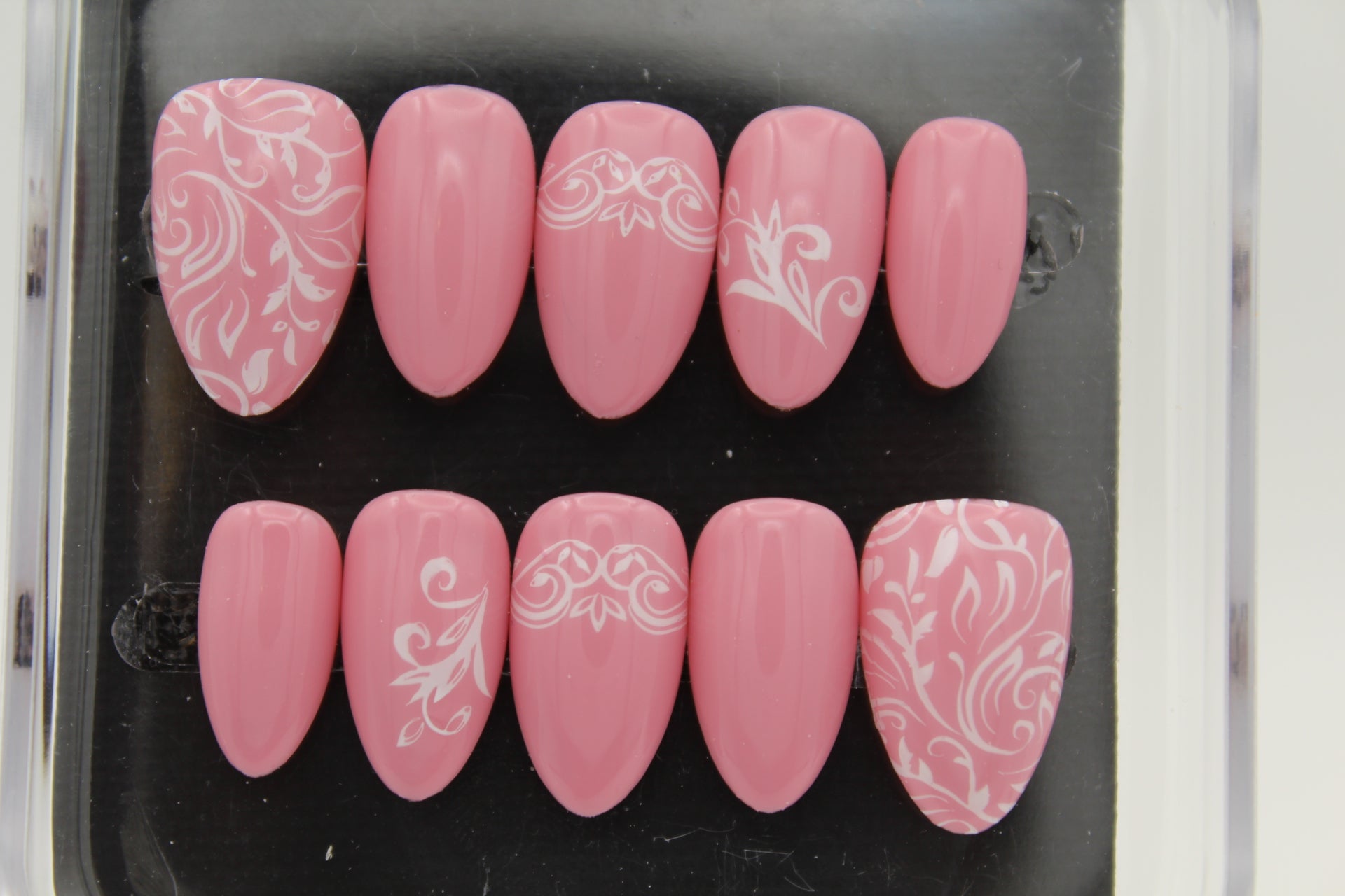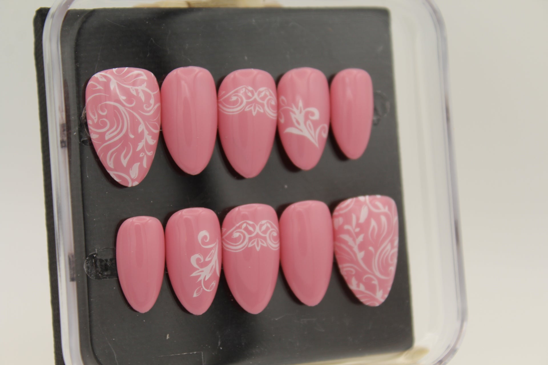 Be the prettiest in pink with this classy and feminine accessory. The light pink background is adorned with elegant white scroll work accents, making it a perfect combination of beauty and sophistication. Elevate any outfit with this unique and stylish set!