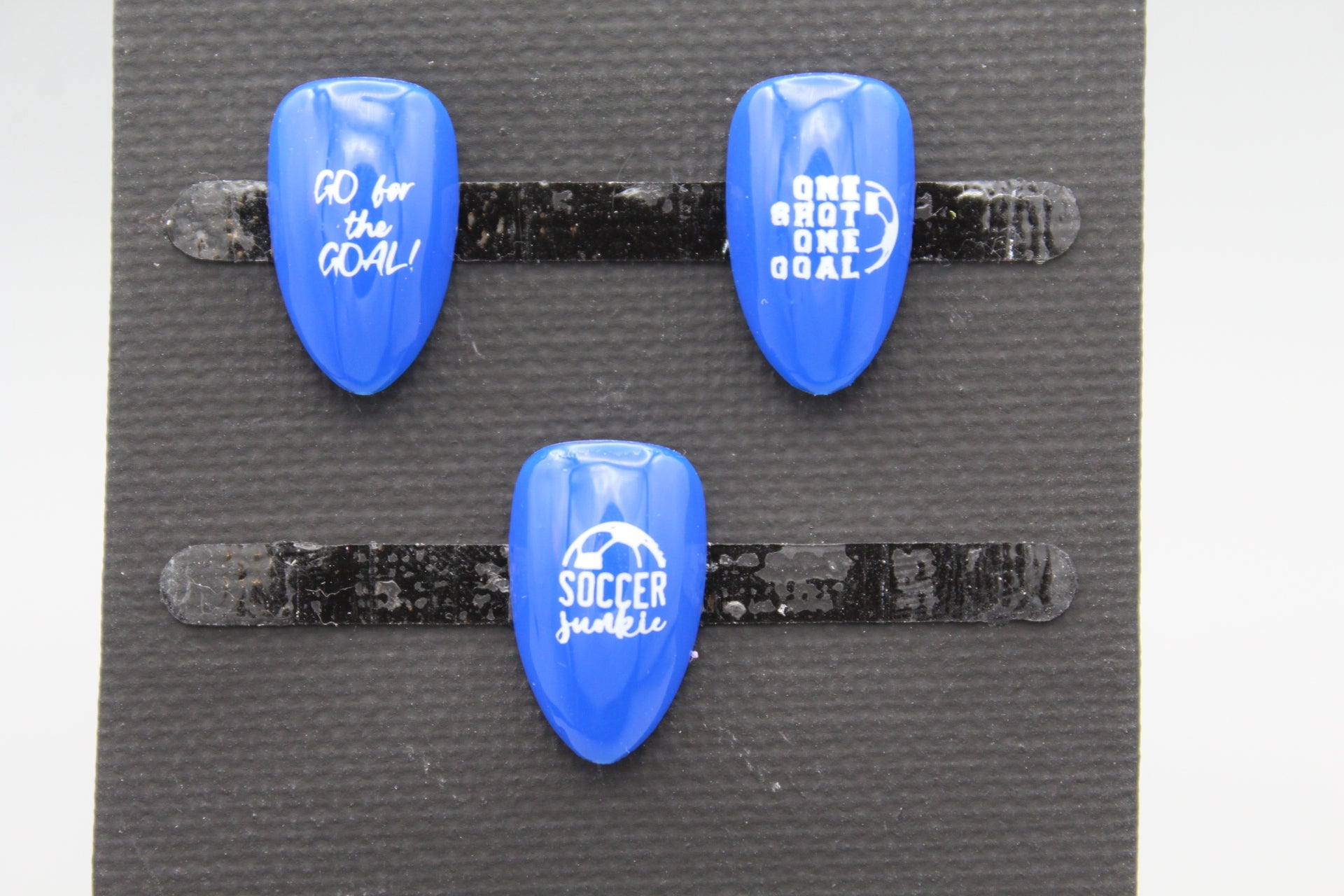 Score big with our Soccer nail set! These playful nail designs feature soccer balls, related sayings, and team colors that let you show off your love for the game. Add your lucky jersey number for that extra touch of awesome. Don't see the colors you need? No problem, send us an email and we will do our best to accommodate.