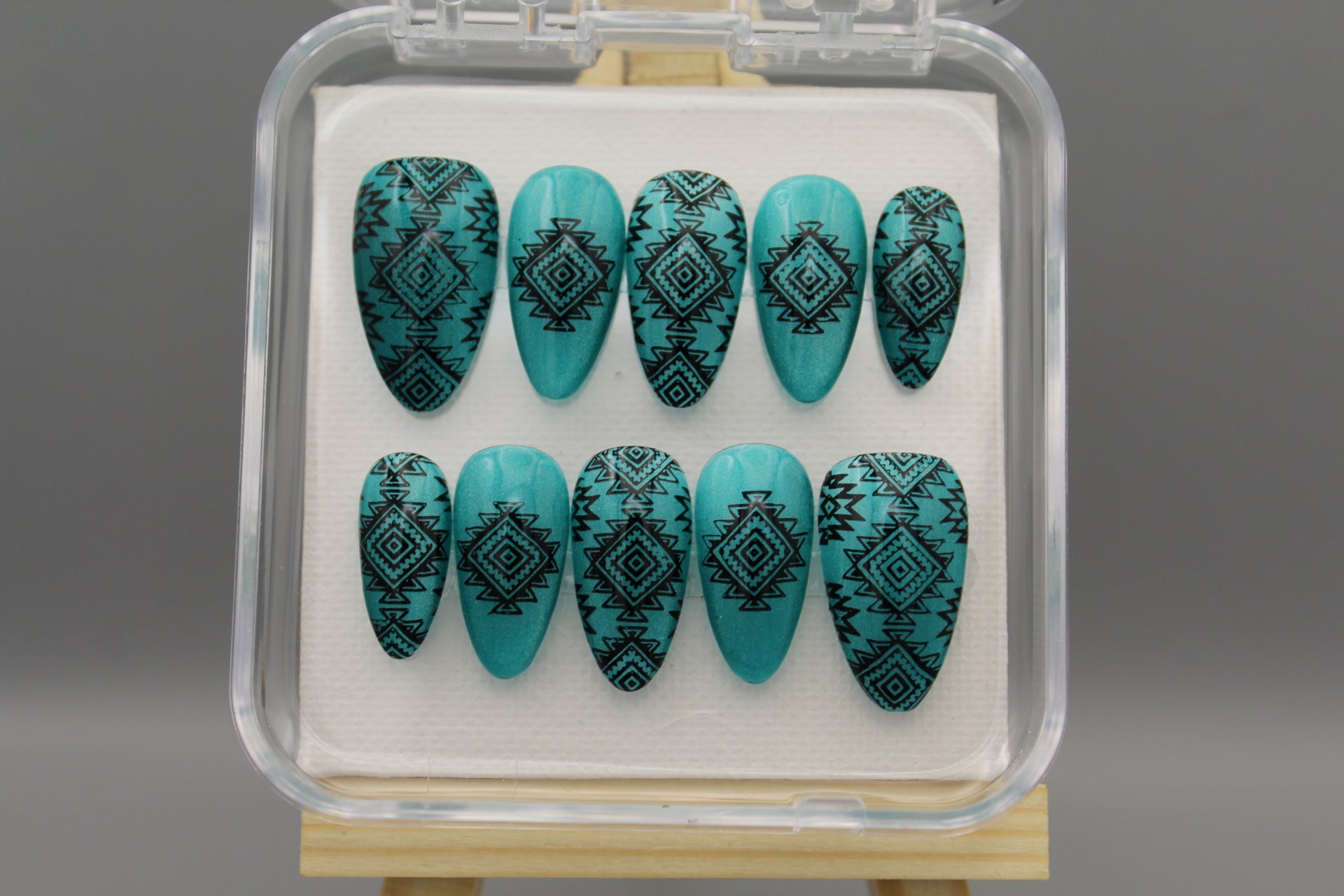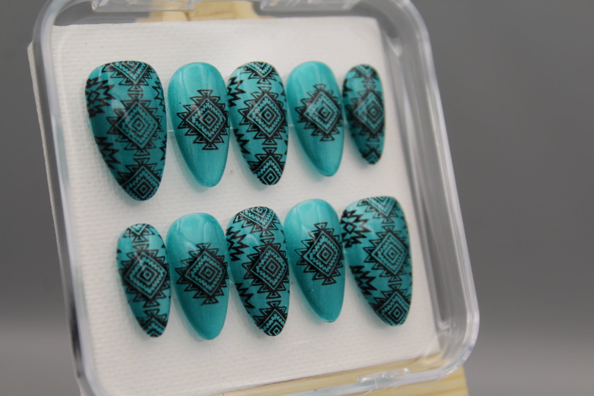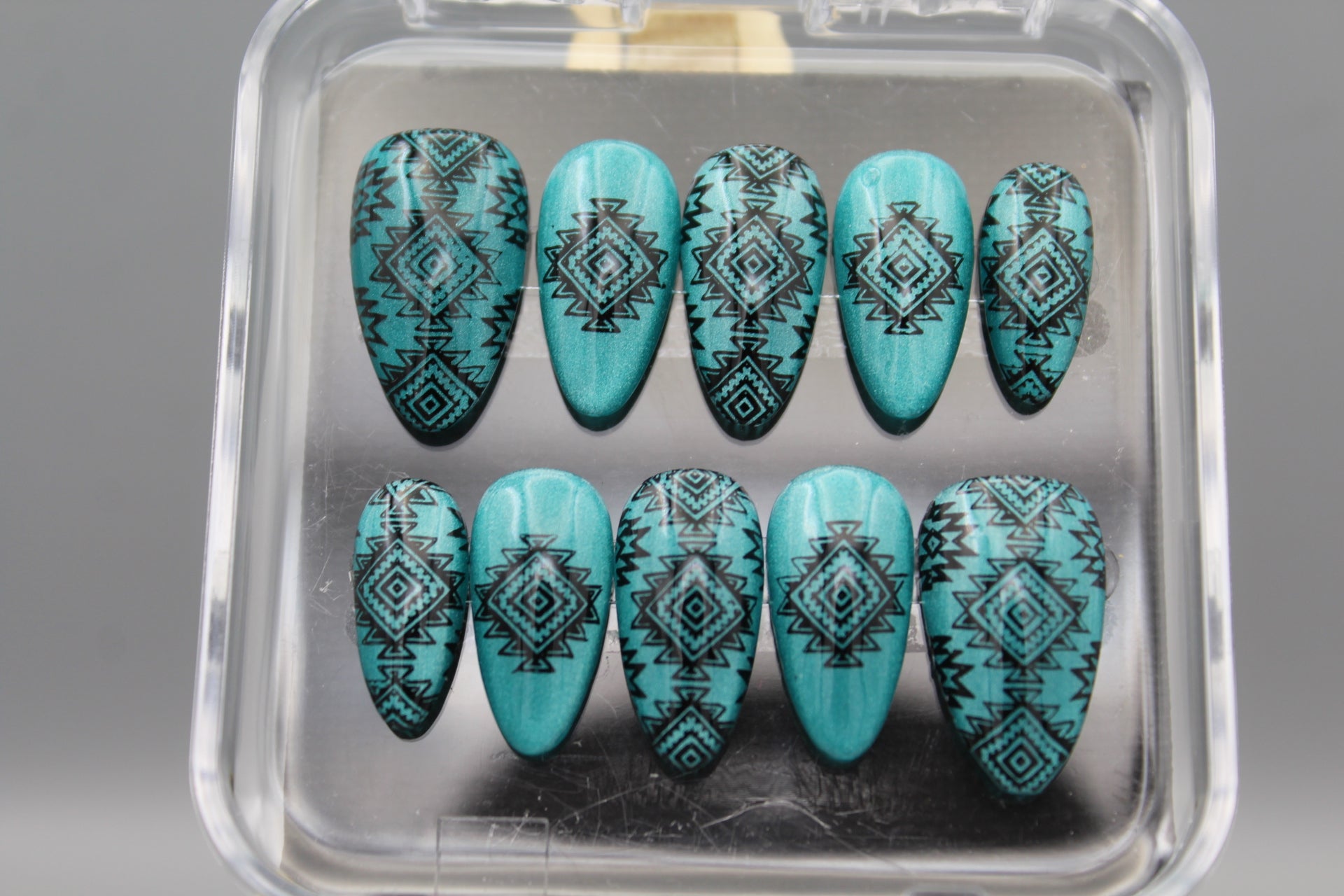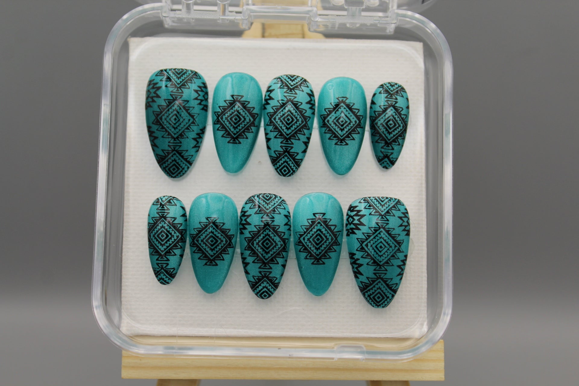 Add a splash of southwestern charm to your look with the Desert Dreams nail set. Featuring bold designs inspired by desert landscapes and cultural motifs, these nails shine against a shimmering, light catching turquoise background. Perfect for those who want to mix classy style with a playful, adventurous spirit.