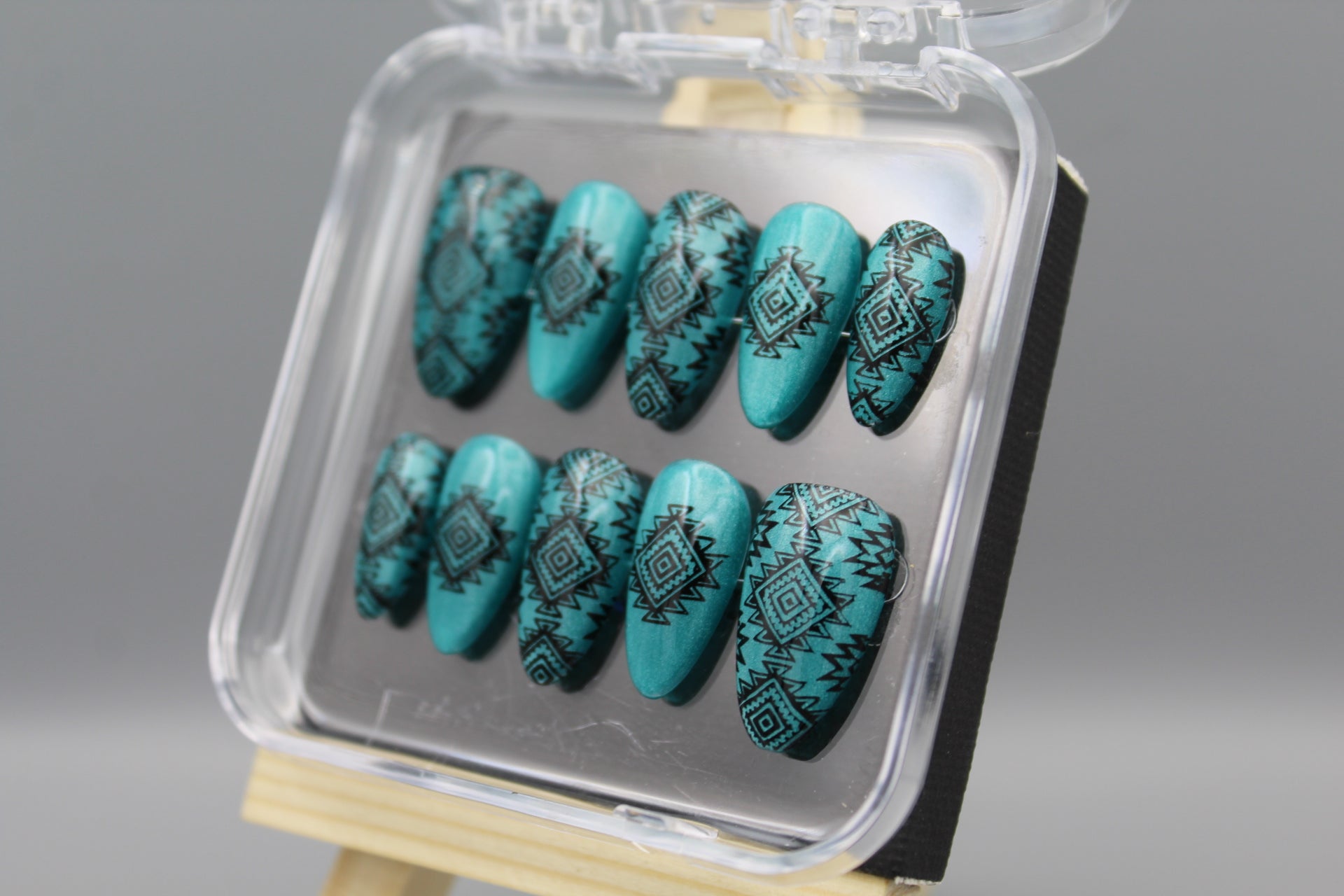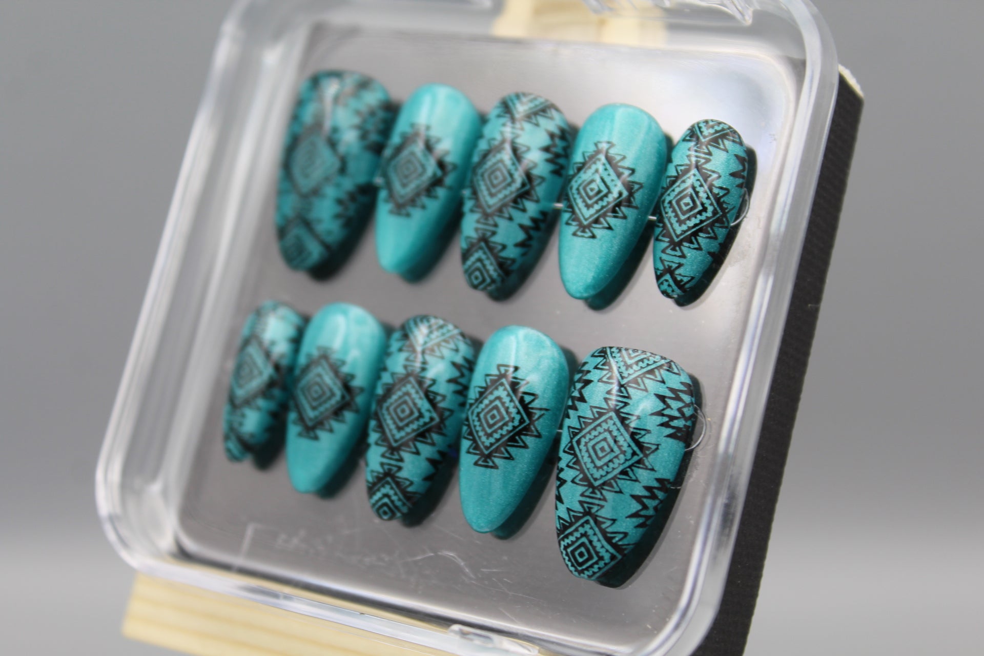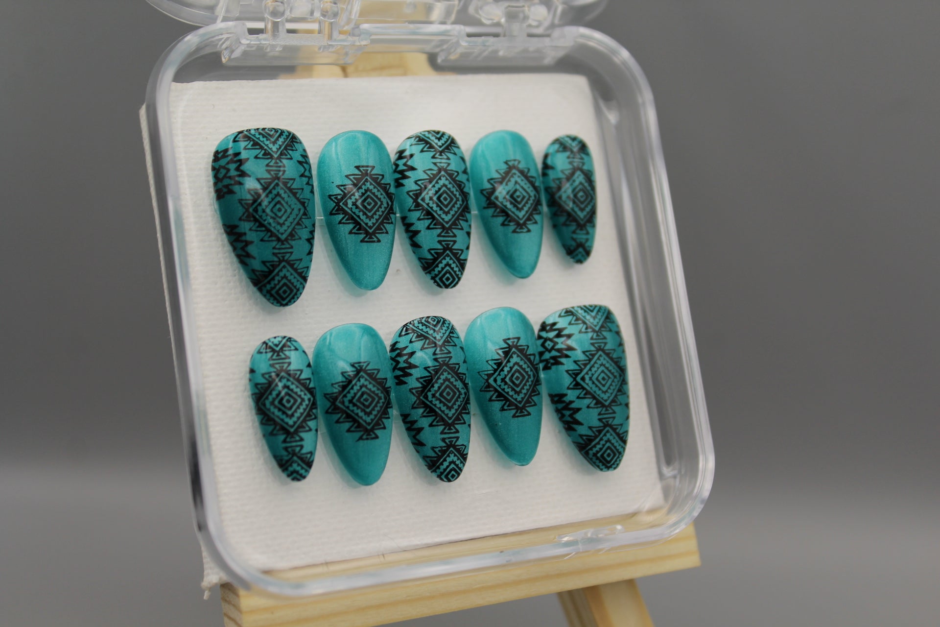 Add a splash of southwestern charm to your look with the Desert Dreams nail set. Featuring bold designs inspired by desert landscapes and cultural motifs, these nails shine against a shimmering, light catching turquoise background. Perfect for those who want to mix classy style with a playful, adventurous spirit.