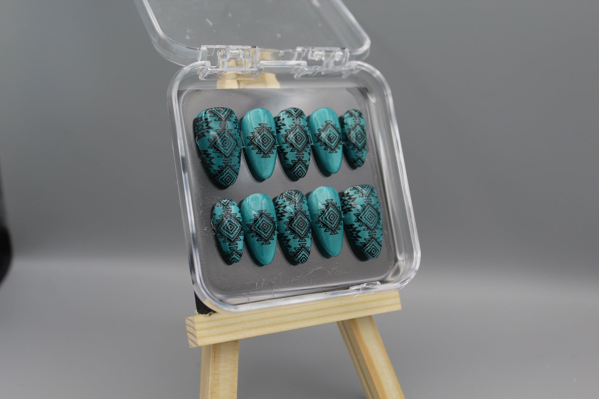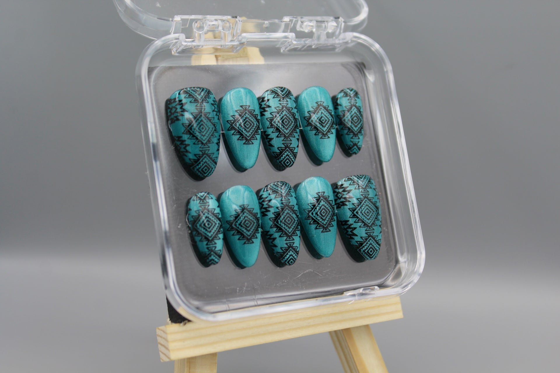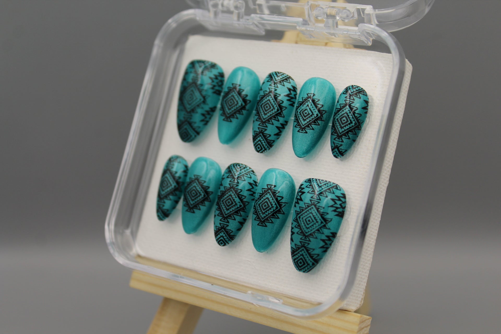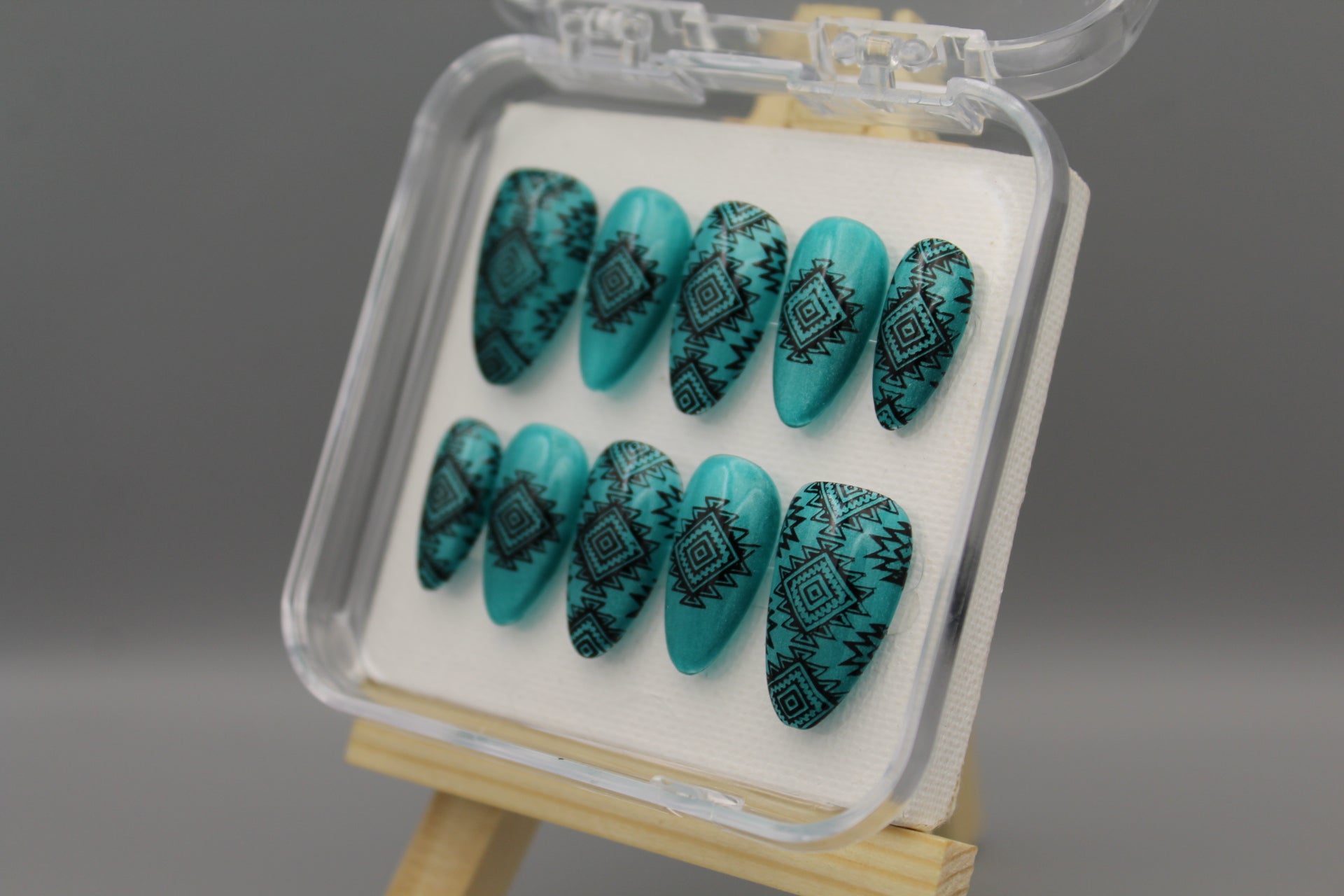 Add a splash of southwestern charm to your look with the Desert Dreams nail set. Featuring bold designs inspired by desert landscapes and cultural motifs, these nails shine against a shimmering, light catching turquoise background. Perfect for those who want to mix classy style with a playful, adventurous spirit.