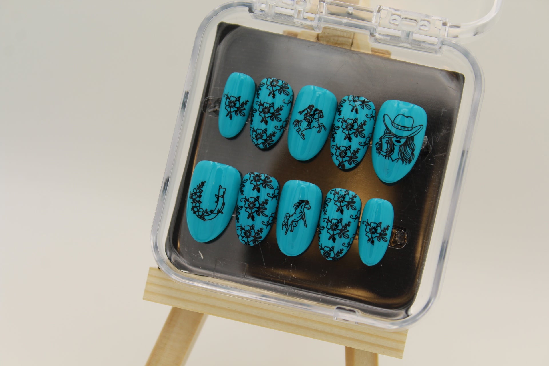 Get in touch with your inner cowgirl with Wyld Flowers! This playful turquoise base with black floral accents is perfect for anyone with a free spirit and a love for all things western. Unleash your attitude and add a touch of wild to any outfit. Giddy up, wyld horses!